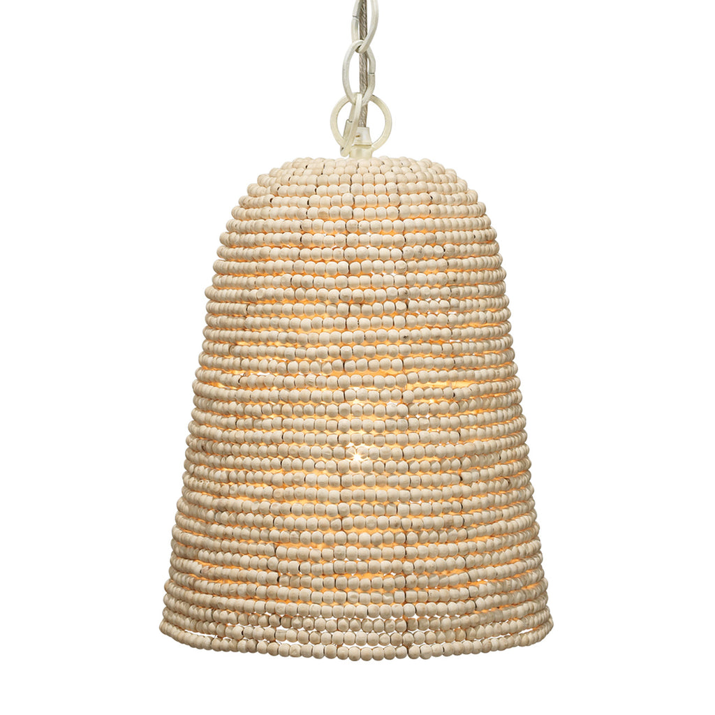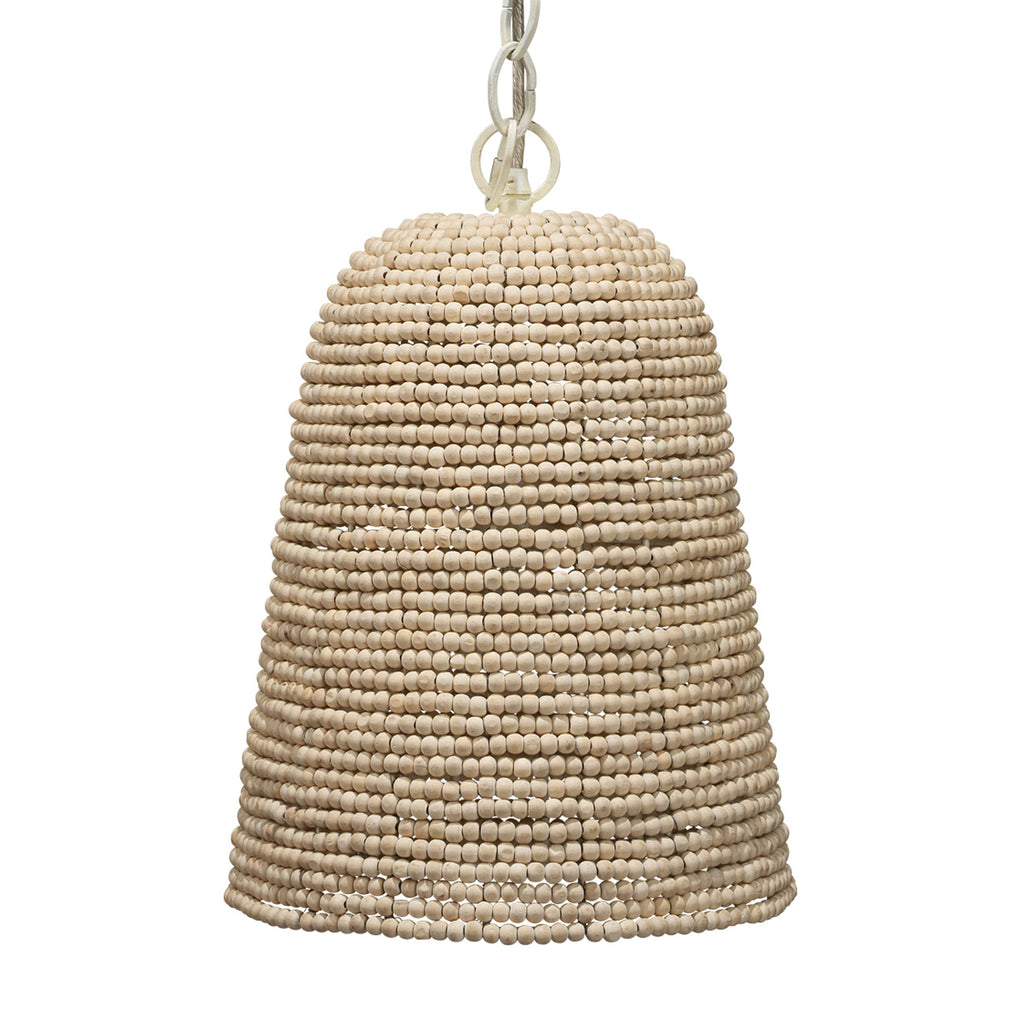 Strings of beads made with mango wood line the body of the oversized Jamie Young Canal Pendant. A white iron chain compliments the natural tone and texture of this piece. A statement piece with repeating patterns and textures like this can help add interest to any coastal palette.