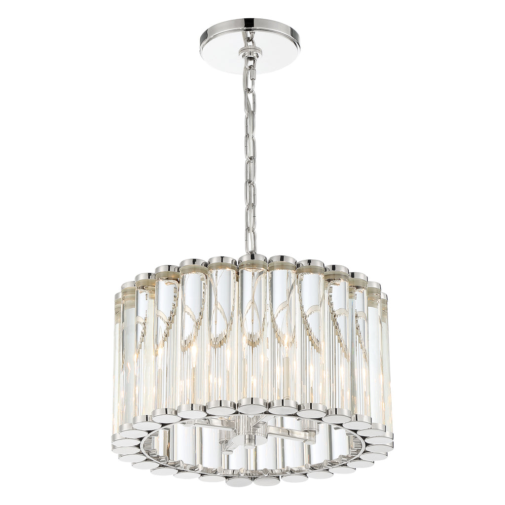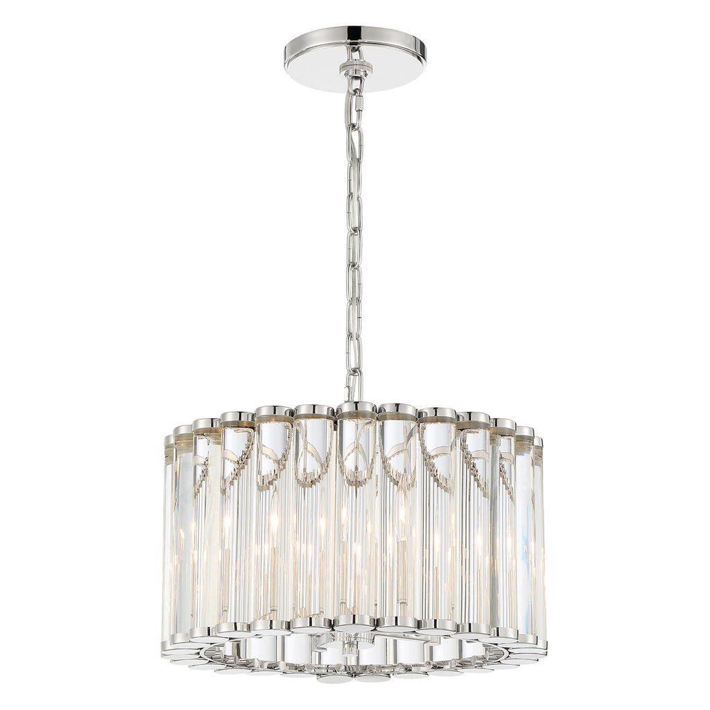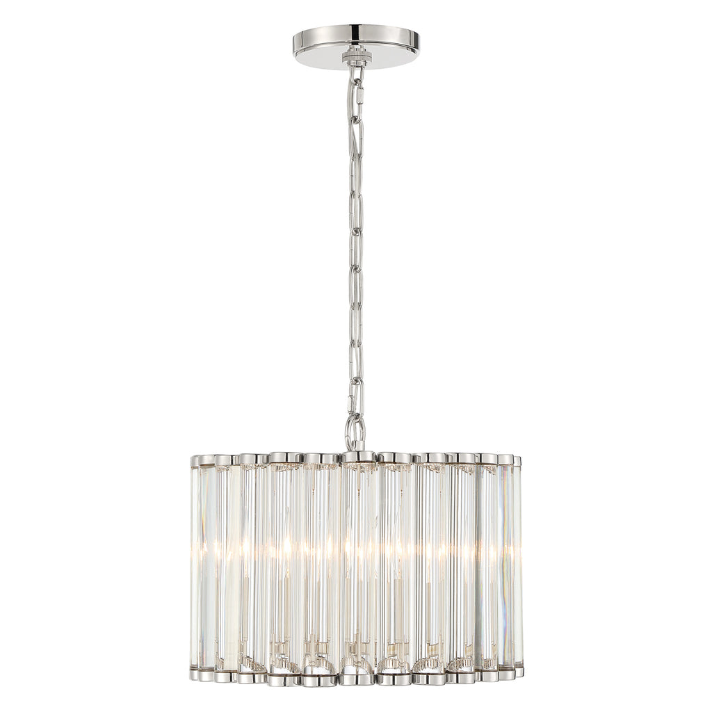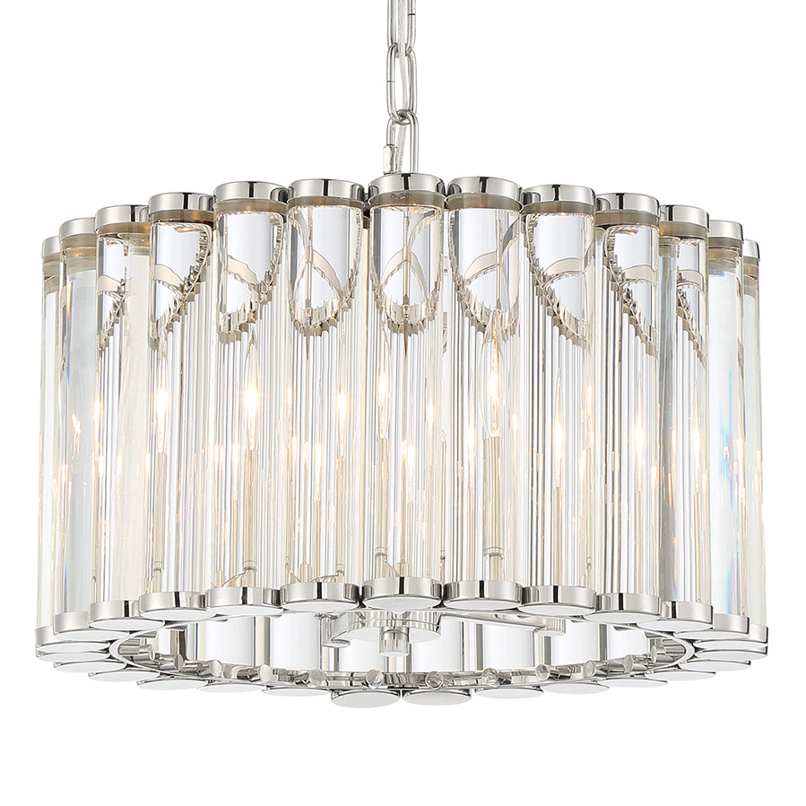 Crystorama is known for its standout lighting, which is exceptional in quality and design. From traditional all-crystal designs to transitional lighting collections, Crystorama offers styles that will match any décor and are always in fashion. The Crystorama Elliot collection, designed by Libby Langdon, is a sleek and almost masculine collection featuring a series of chunky glass rods and a polished nickel frame to highlight the shape. The fixture's view from below is as important as what it looks like from the side. The metalwork follows the shape of the circular rods creating a scallop pattern. The filtered light bounces between the glass rods and gives off a beautiful glow. Architectural in nature, the Elliot is a modern take on a crystal-style chandelier.