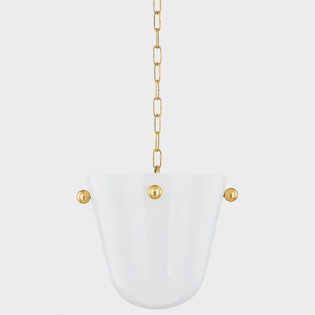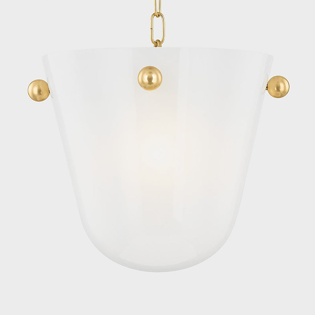 Clean, chic, and minimalist, Mitzi Rima revisits vintage design elements in a fresh way. The large, rounded shade is cast from opal seedy glass to give this pendant its subtle, artful feel. Decorative Aged Brass knobs elevate the simple silhouette with their jewelry-like presence.