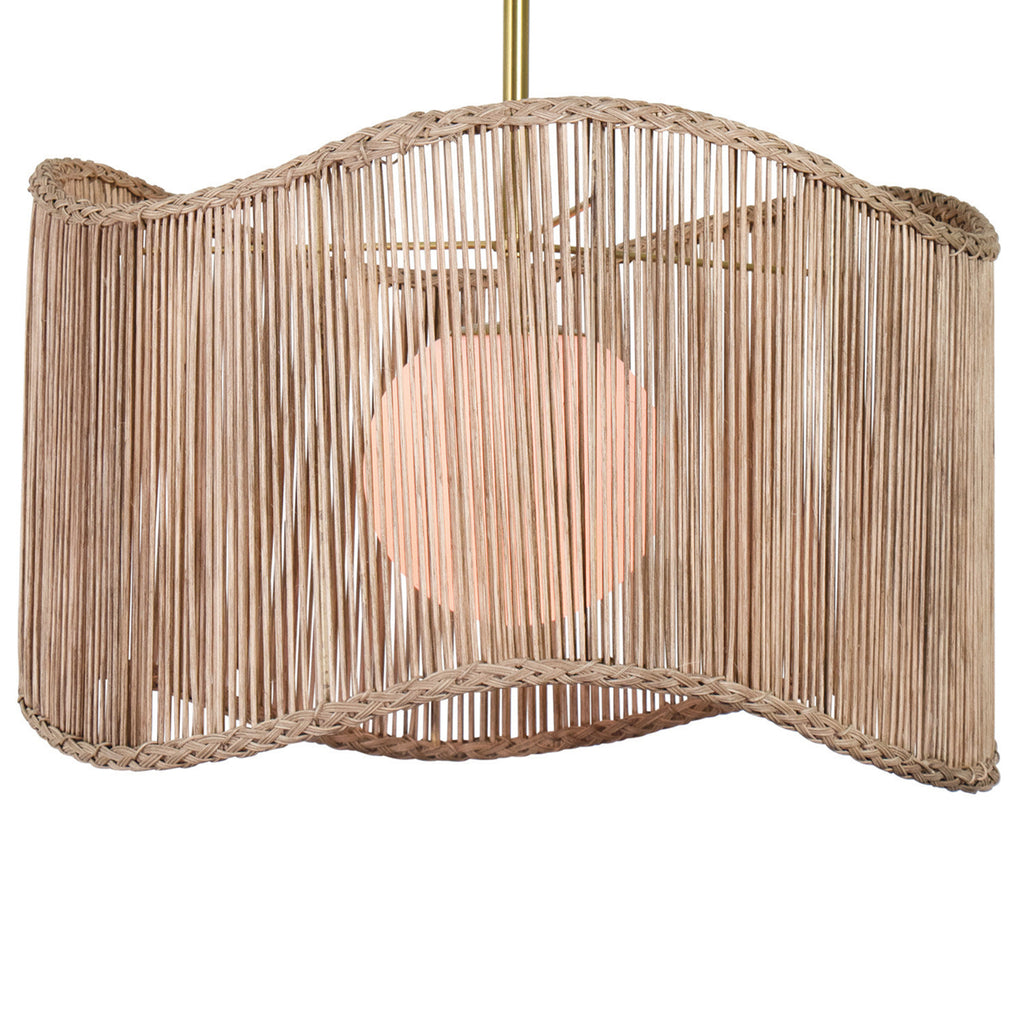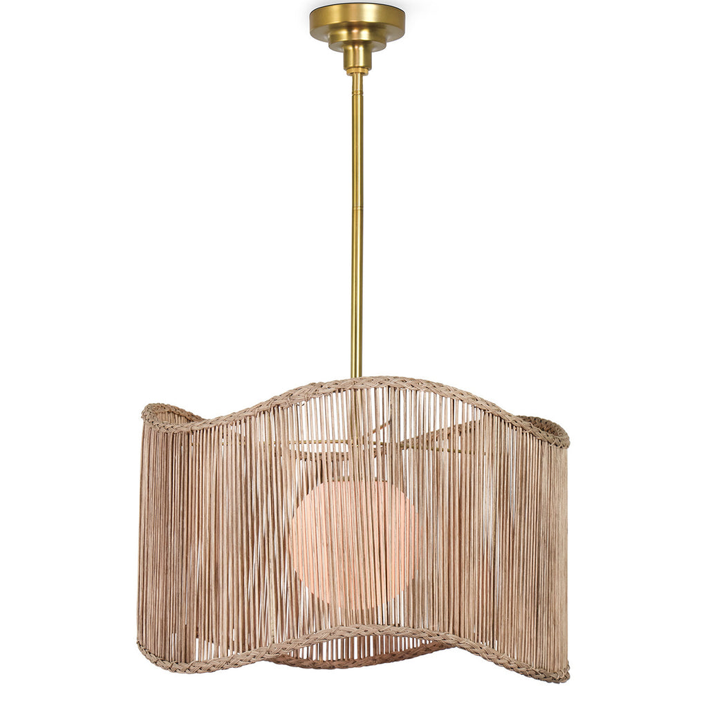 A wide, wavy, woven shade surrounds a white milk glass globe in the Nimes Drum Pendant. Finished in natural brass, the fixture’s braided edge ebbs and flows, casting a warm light with discreet elegance.
