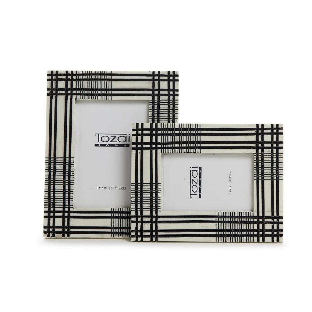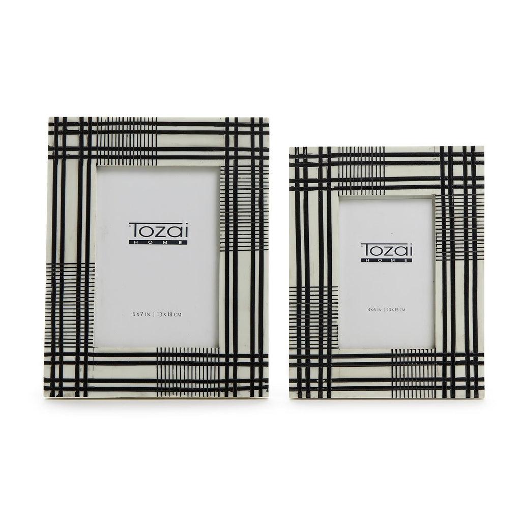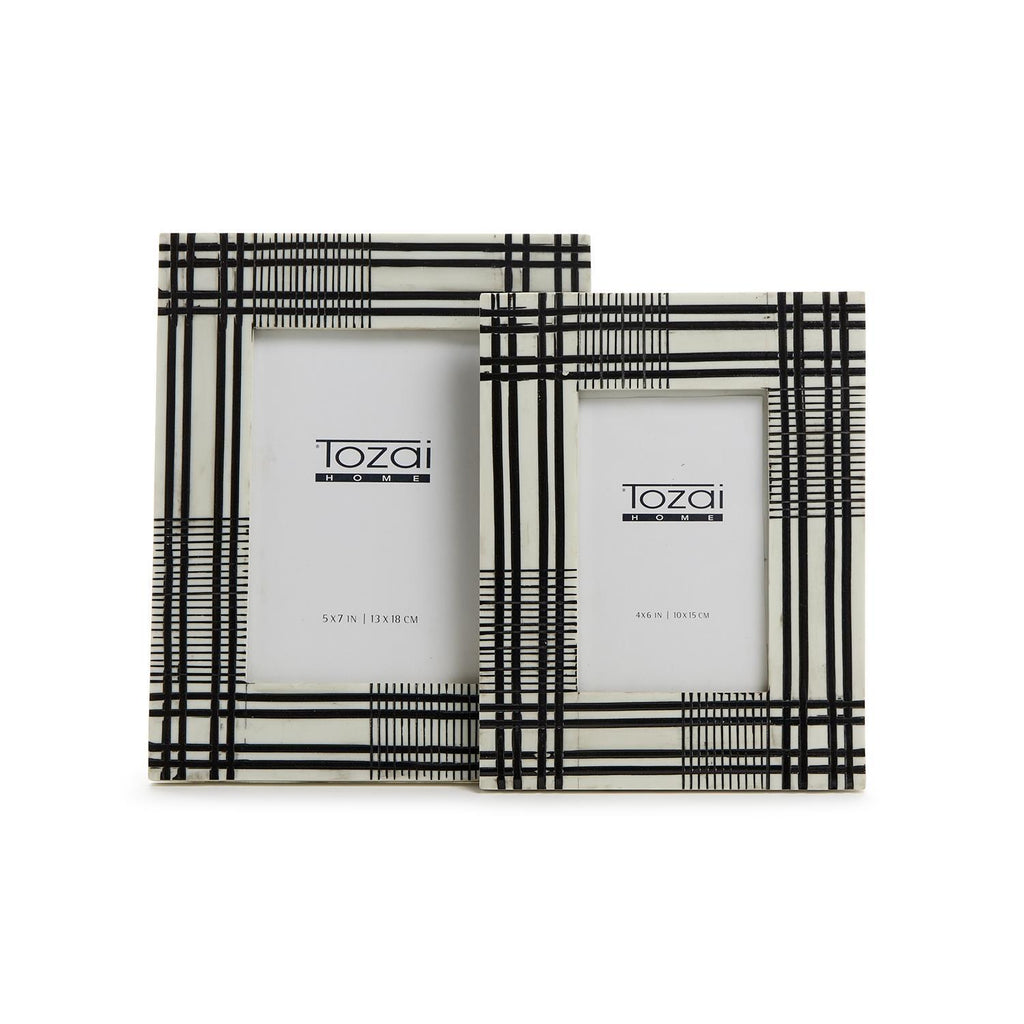 Elevate your cherished memories with this modern plaid set of two black and white photo frames. These frames come in two versatile sizes perfect for displaying 4in x 6in and 5in x 7in photos either horizontally or vertically. The sleek design adds a contemporary touch to any space, making them a perfect addition to your chic home decor.