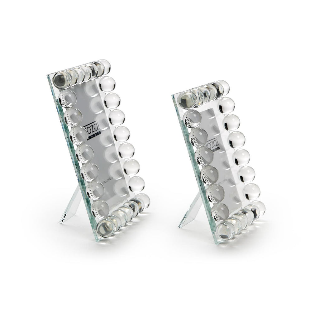 Elevate your cherished memories with the bubbles set of 2 crystal glass photo frames. Crafted from perfectly sculpted crystal clear glass, these frames come in two sizes to accommodate both 4" x 6" and 5" x 7" photos, standing beautifully in both horizontal and vertical orientations. The intricate bubble design reflects light so beautifully and is sure to add a touch of sophistication to any space. Perfect for displaying your most special moments.