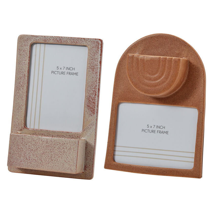 Pop a 5x7 photo & an air plant in the rectangular ceramic Farran Frame for an organic addition to tabletop decor. Opening in front is ideal for a small succulent or household odds & ends. With a playful design, & soft, rounded edges, this frame adds a warm, handmade look to interior design. As a retail item, this piece will liven up shelves in modern plant shops or home & gift stores.