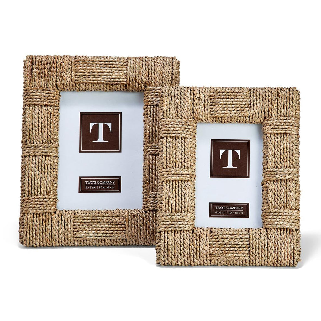 Celebrating natural materials this set of 2 frames are wrapped in twisted braided sea grass rope. Stands horizontally or vertically.