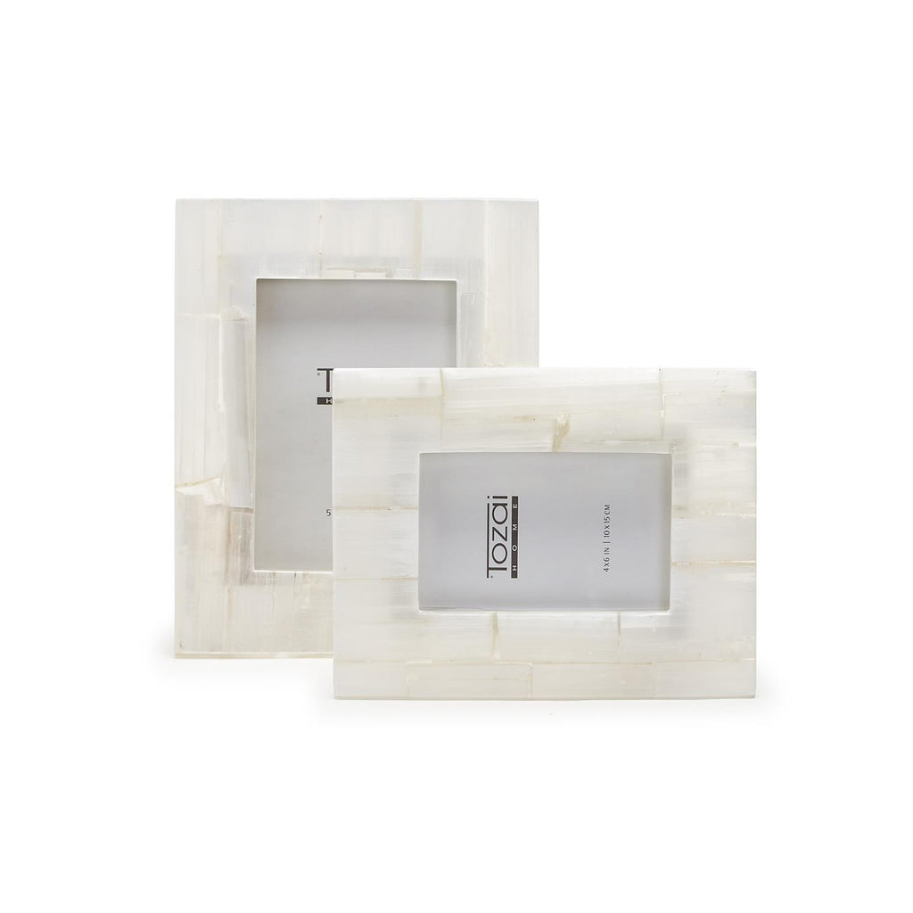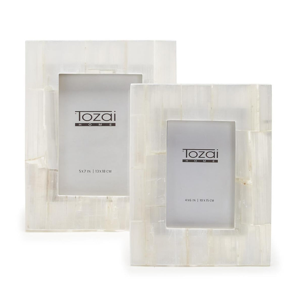 Elevate your home design with the exquisite sophistication of this 2-piece set of natural selenite picture frames. Mined in the captivating landscapes of Morocco, this lustrous material exudes an innate beauty that transcends ordinary frames. Each genuine selenite frame offers a textured and enchanting addition to any space, effortlessly blending into the captivating world of stones and minerals. Embrace the uniqueness of natural selenite, as each piece showcases its distinct variances in color and pattern, ensuring that no two frames are exactly alike. Immerse yourself in the allure of these artful creations, where the timeless elegance of selenite transforms your cherished photographs into captivating works of art.