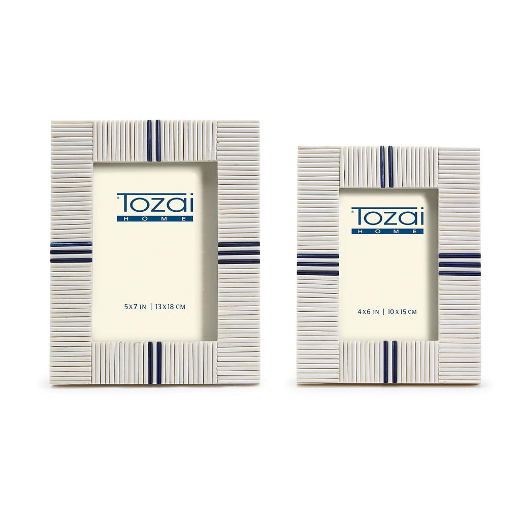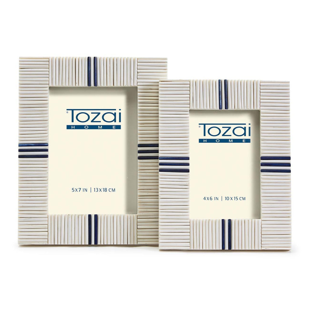 So modern but so chic. This frame is beautifully made with 100% bone. Each bone pc is hand cut and placed symmetrically to create a sculptured graphic look. With the added accents of blue or black these will be a welcome addition to many decors.