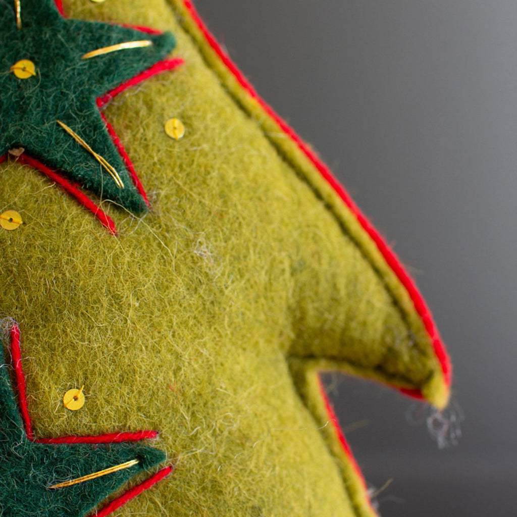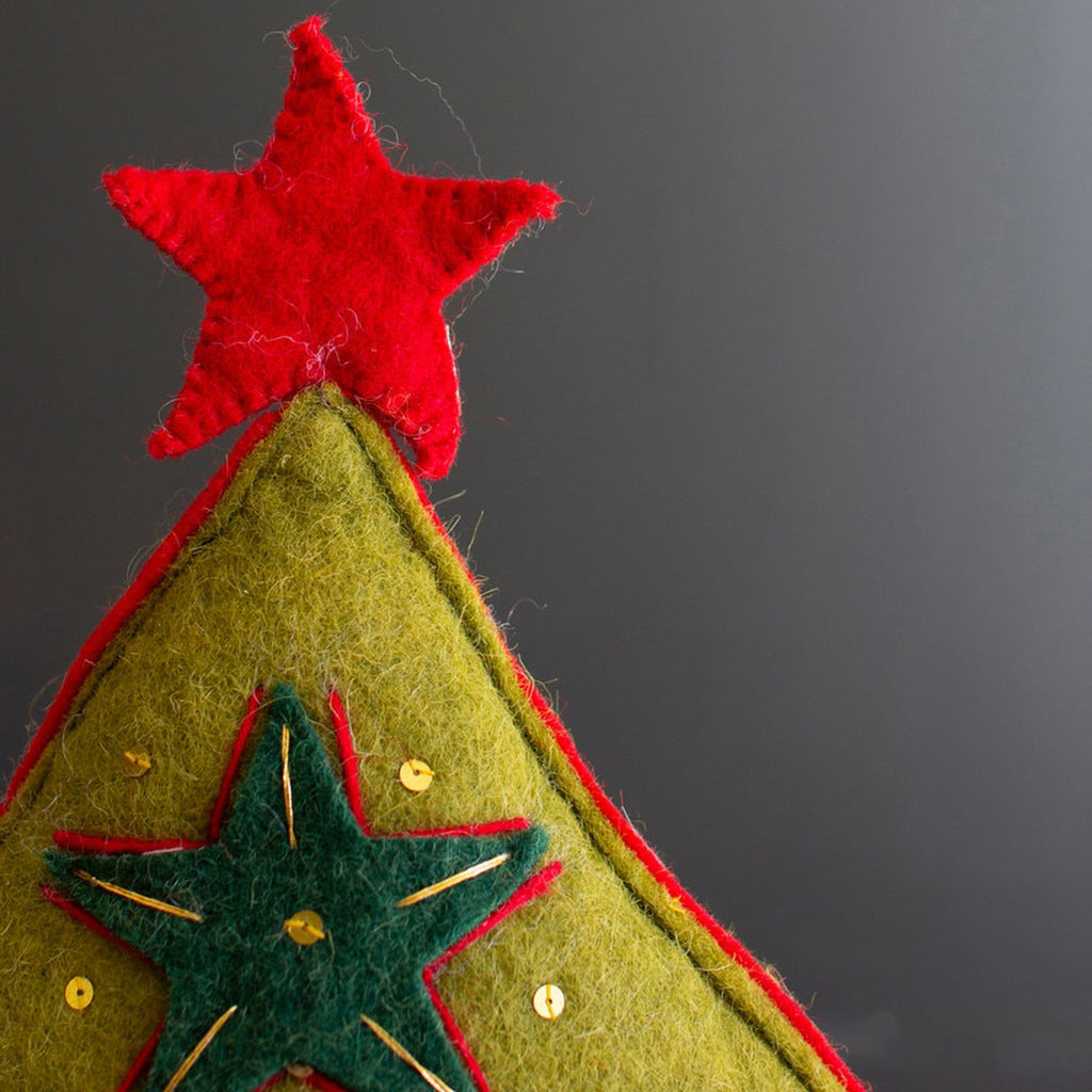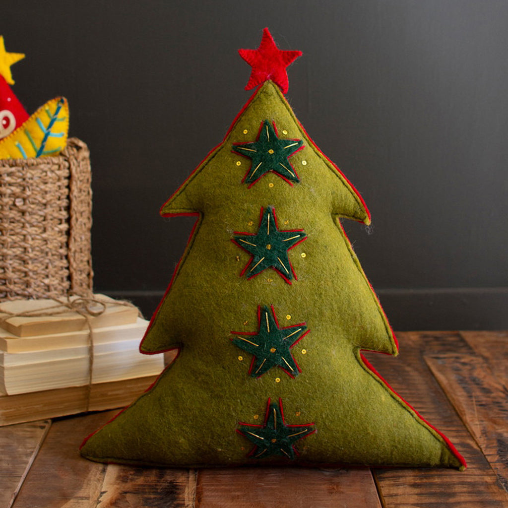 Add this felt Christmas tree pillow in green to any chair. It has a red star topper and green star details. Make it a holiday set with others in the collection.