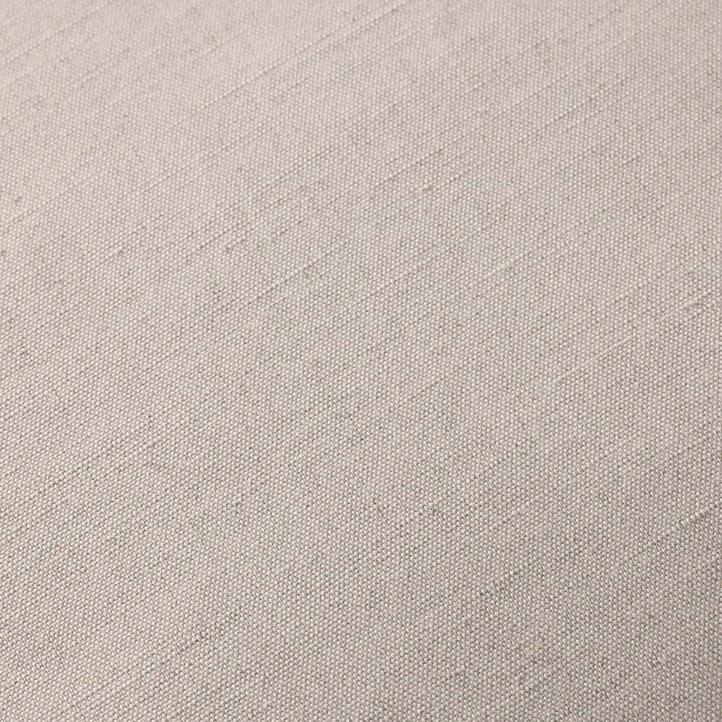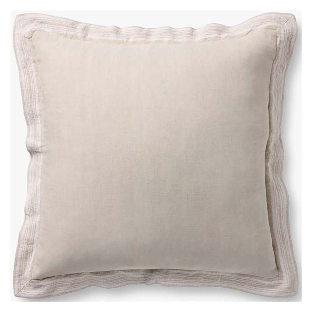 This neutral gray pillow is elevated by a subtle stripe on its flange edges, a versatile accent piece for living rooms, bedrooms, and more. The 22in x 22in square pillow is woven in India of linen and cotton.