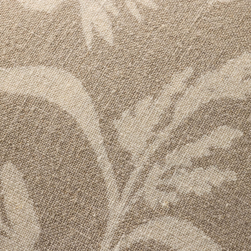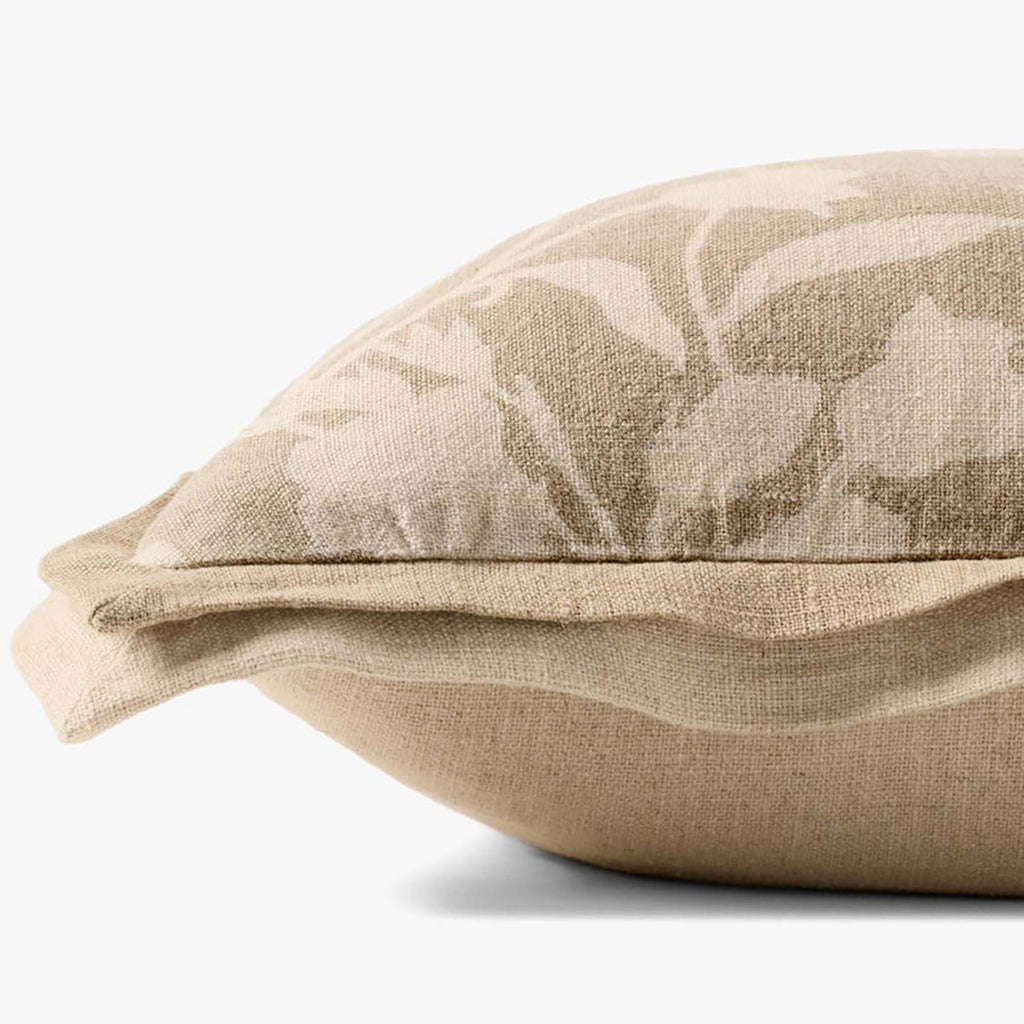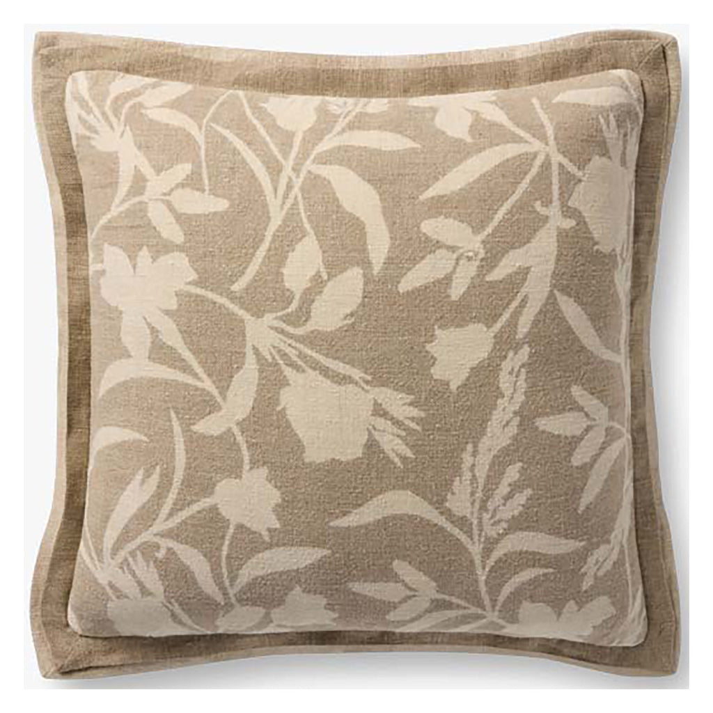 This linen throw pillow features an elegant white floral design with double flange edges for farmhouse, coastal, or organic home decor. The 18in x 18in square pillow is woven in India of linen and cotton.