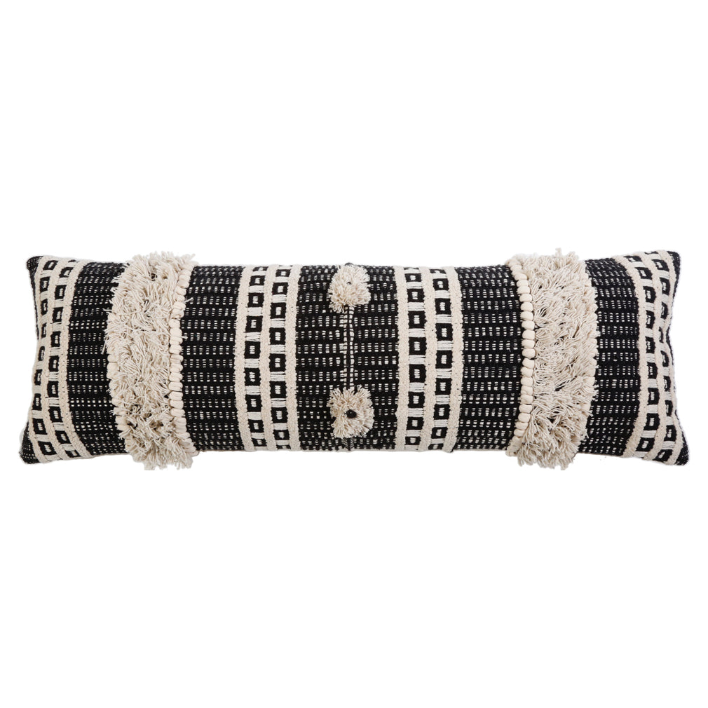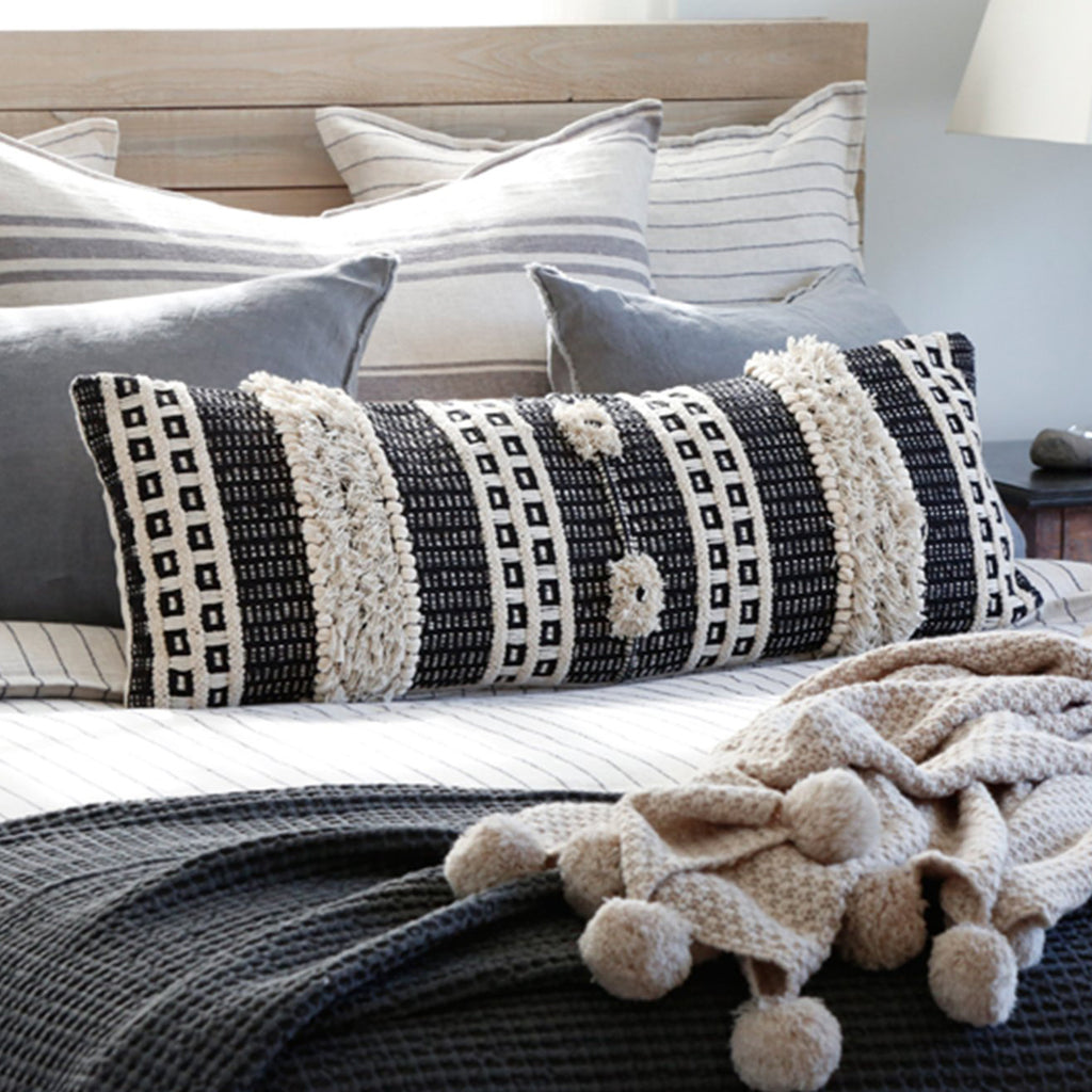 Fusing romantic style with a passion for sustainability, Pom Pom at Home's collection effortlessly exudes a lived-in elegance. The Sawyer pillow is handwoven cotton with alternating stripes of tassels, knots, pom poms, and geometric design.