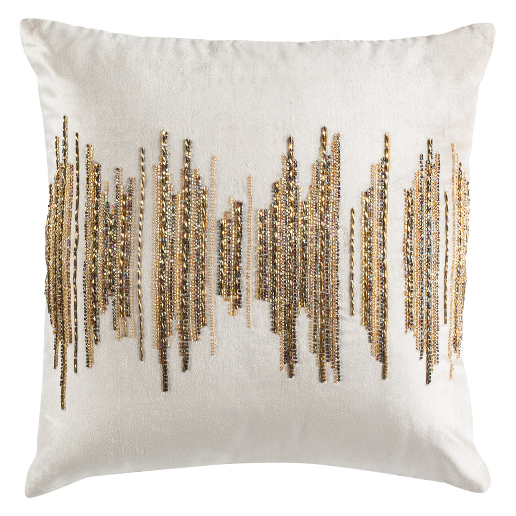 Glamorous and chic, the Thea Pillow is a radiant addition to urbane home decor. Bands of metallic tinsel are stitched into a free-spirited pattern of shimmering viscose and soft cotton, with subtle tonal variation created through beige, gold and copper tones. A marvelous energetic accent for the sofa or chaise lounge. Beige/Gold/Copper. Viscose/Cotton. Polyfill insert included. Dry clean only.
