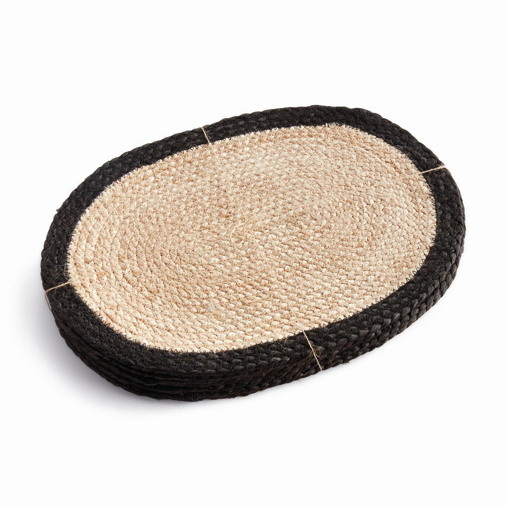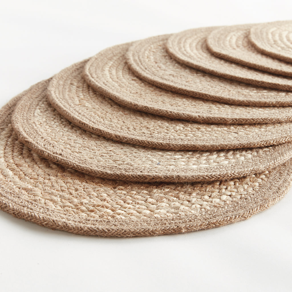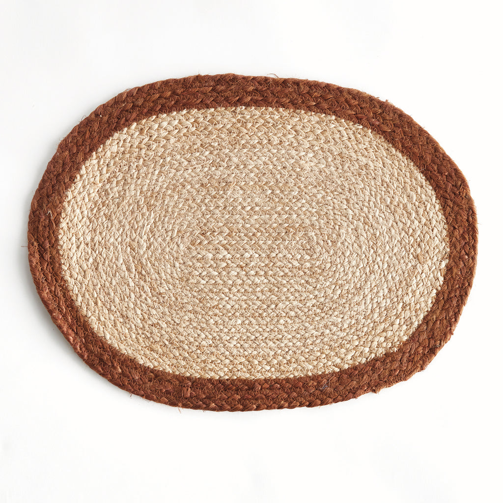 This set of eight oval placemats adds a natural element to your tablescape. Ideal for special occasions as well as everyday use. Each placemat is made of real jute, coil woven by a skilled artisan, and finished off with a dyed brown border. The thick weave adds a warm, welcoming feel. A simply perfect backdrop to any style of dinnerware.