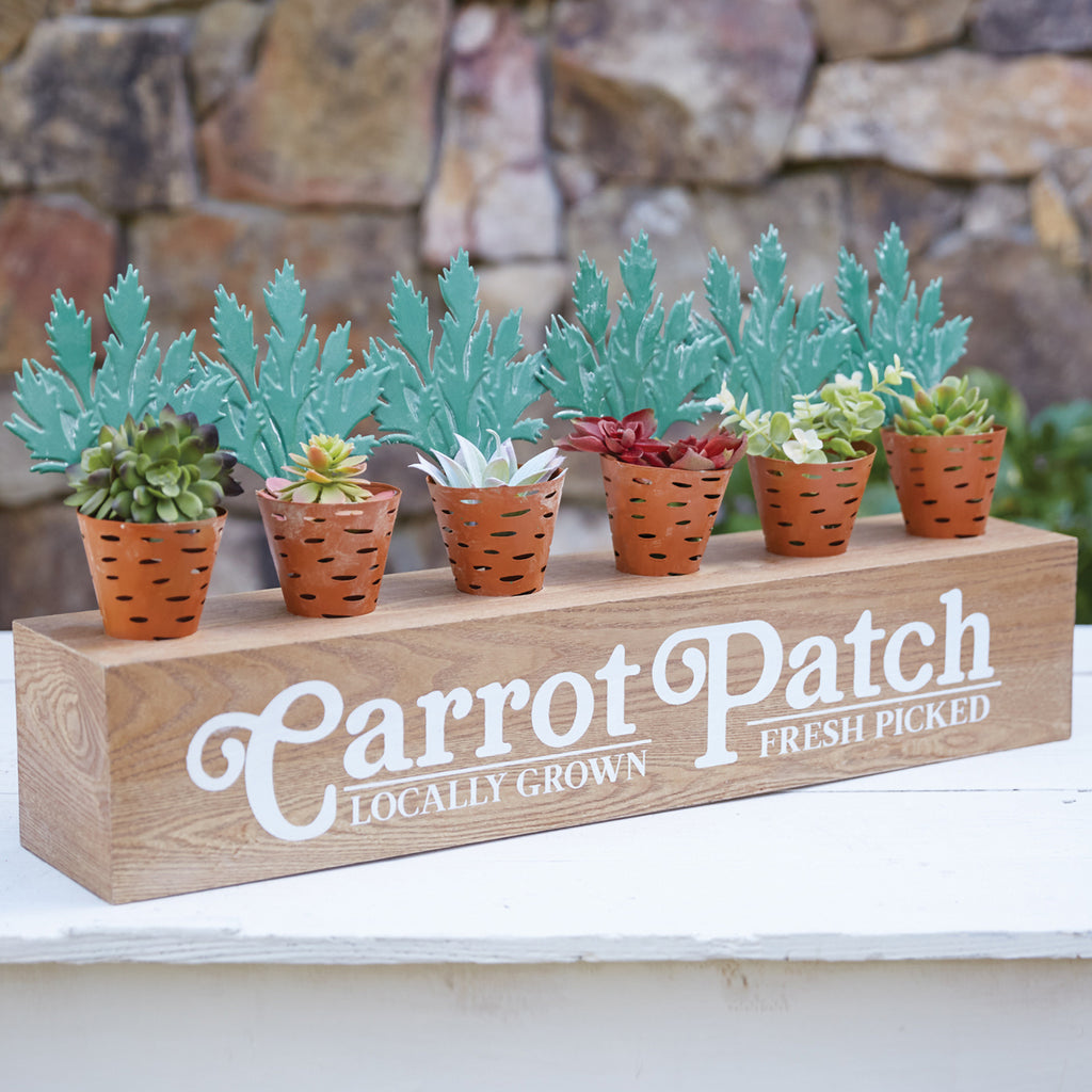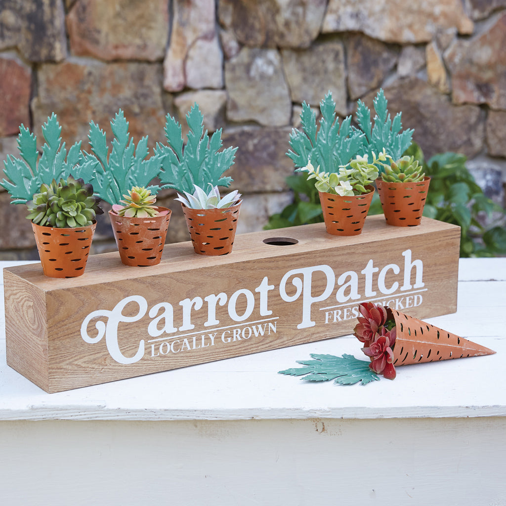 This unique planter box has six removable metal carrots for displaying small items, Easter treats, or small plants.