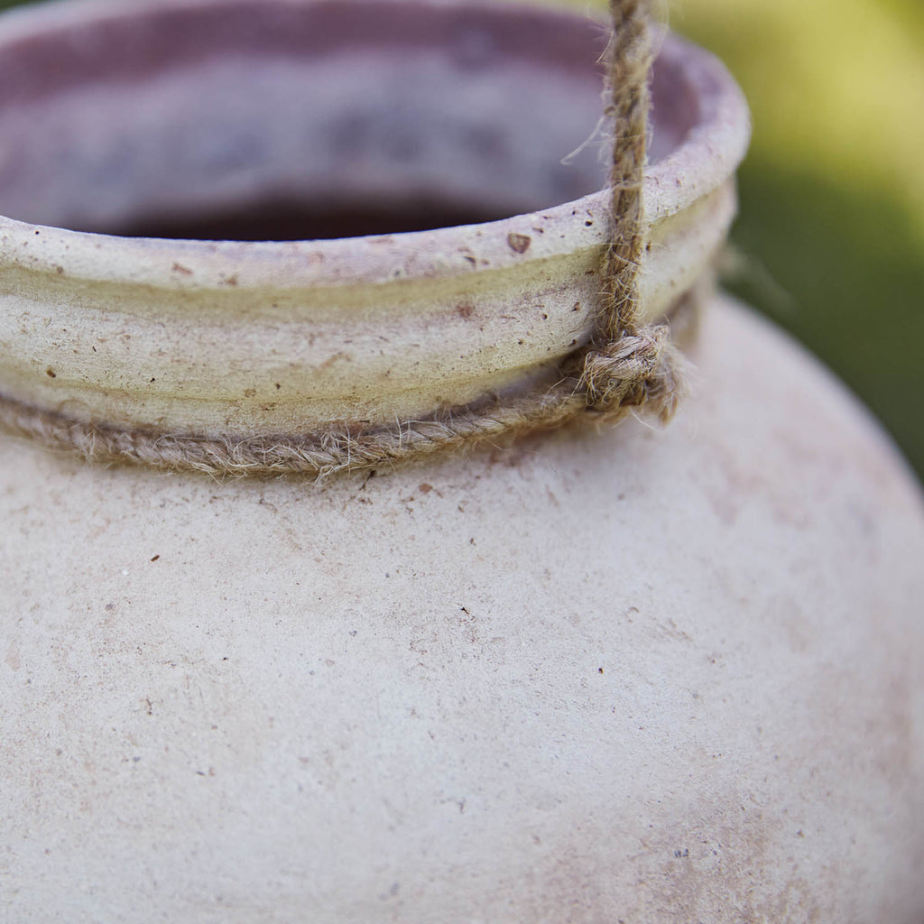 Inspired by Indian clay water pots, this planter will evoke feelings of wanderlust. Its delicately handmade details and beaded accents provide bohemian elements to a patio or garden. Planter is created with natural clay and jute rope. It features one drainage hole. When hung, the planter measures 9.5in dia. x 28in H.