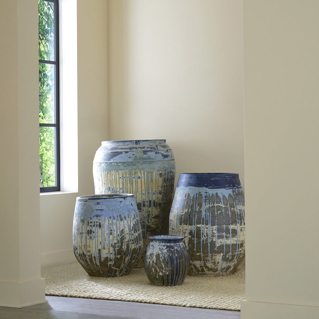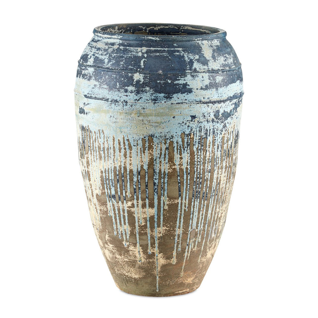 Made of terracotta with antique white and blue drip overlay, the Currey & Co Catania Large Antique Blue Drip Planter is a garden ornament, patio pot or interior accent that looks as if it was left to age for centuries. Whether it has a plant in it or not, it will be a vintage-inspired decorative piece of value.