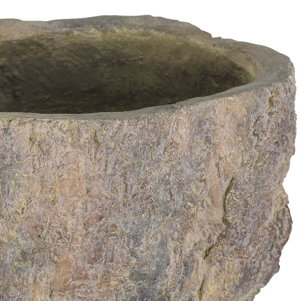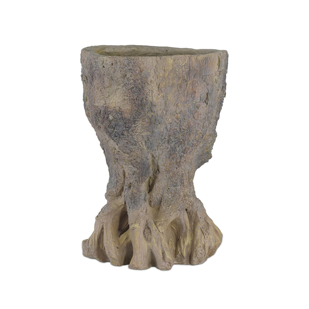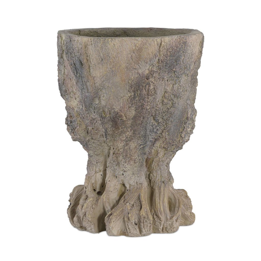 In the tradition of faux bois, the Currey & Co Old Growth Small Planter is incredibly lifelike. Crafted from fiber cement in a dappled finish, the stump-shaped brown planter looks aged like an antique would had it been ornamenting a garden for decades. The way the gnarled roots culminate at the bottom is particularly convincing. This plant pot has a drain hole.
