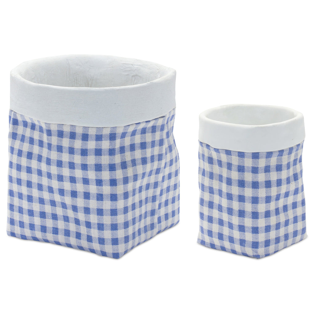 Display your indoor plants in style with this beautiful set of Decorative Gingham Pots. Featuring two assorted sizes, the faux cloth bag design paired with the trendy blue and white gingham pattern is the perfect combination to create a timeless display. The quality cement composition is sure to last for seasons to come. Complete the look by adding a faux potted plant or floral arrangement to each pot.