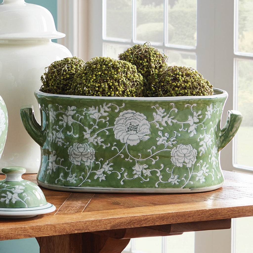 A classic chinoiserie in shades of green & white. How refreshing! The color green is known to have a harmonizing, balancing effect, and is an inspired design choice for the coordinating Imperial Lotus Planter. A welcome addition, bringing stability and calm to the well-appointed kitchen, study or covered porch.