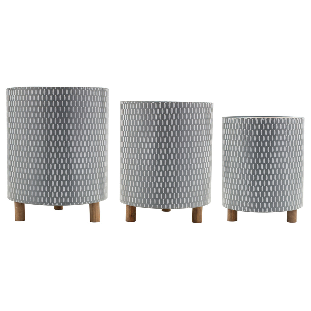 Display your indoor plants in style with this beautiful set of Decorative Metal Planters with legs. Featuring three assorted sizes, the trendy geometric pattern paired with the natural wooden legs is the perfect combination to create a timeless display. The quality iron metal and wood composition is sure to last for seasons to come. Complete the look by adding a faux potted plant or floral arrangement to each pot.