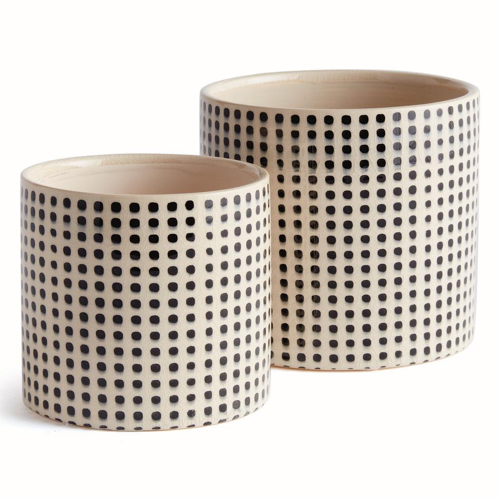 Classic, with a somewhat contemporary edge, these pots are made for the transitional space. A tight repeating dot pattern adorns the perimeter and adds a sophisticated touch.