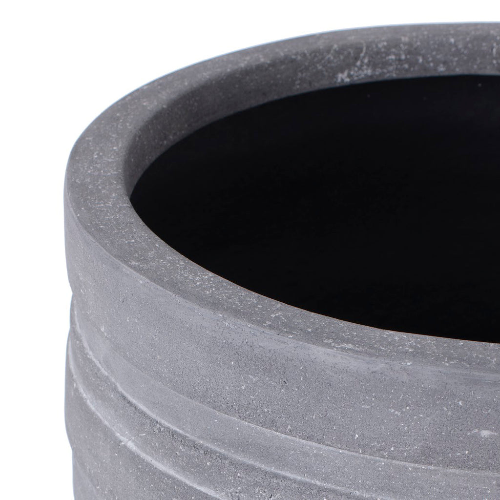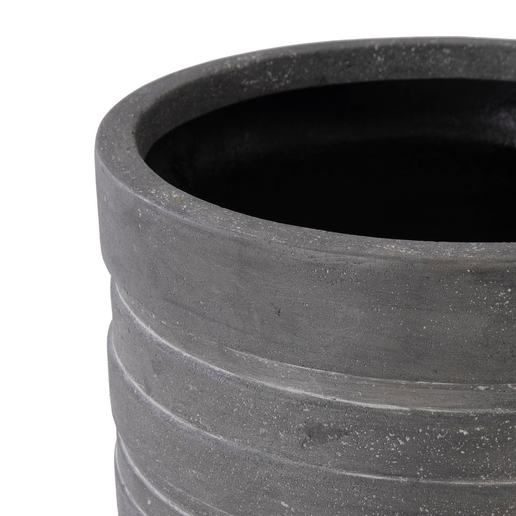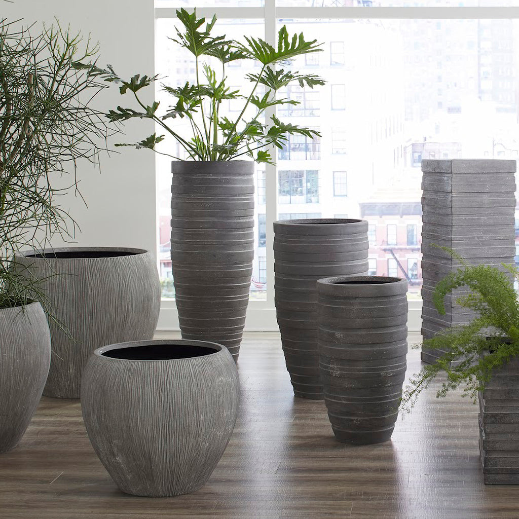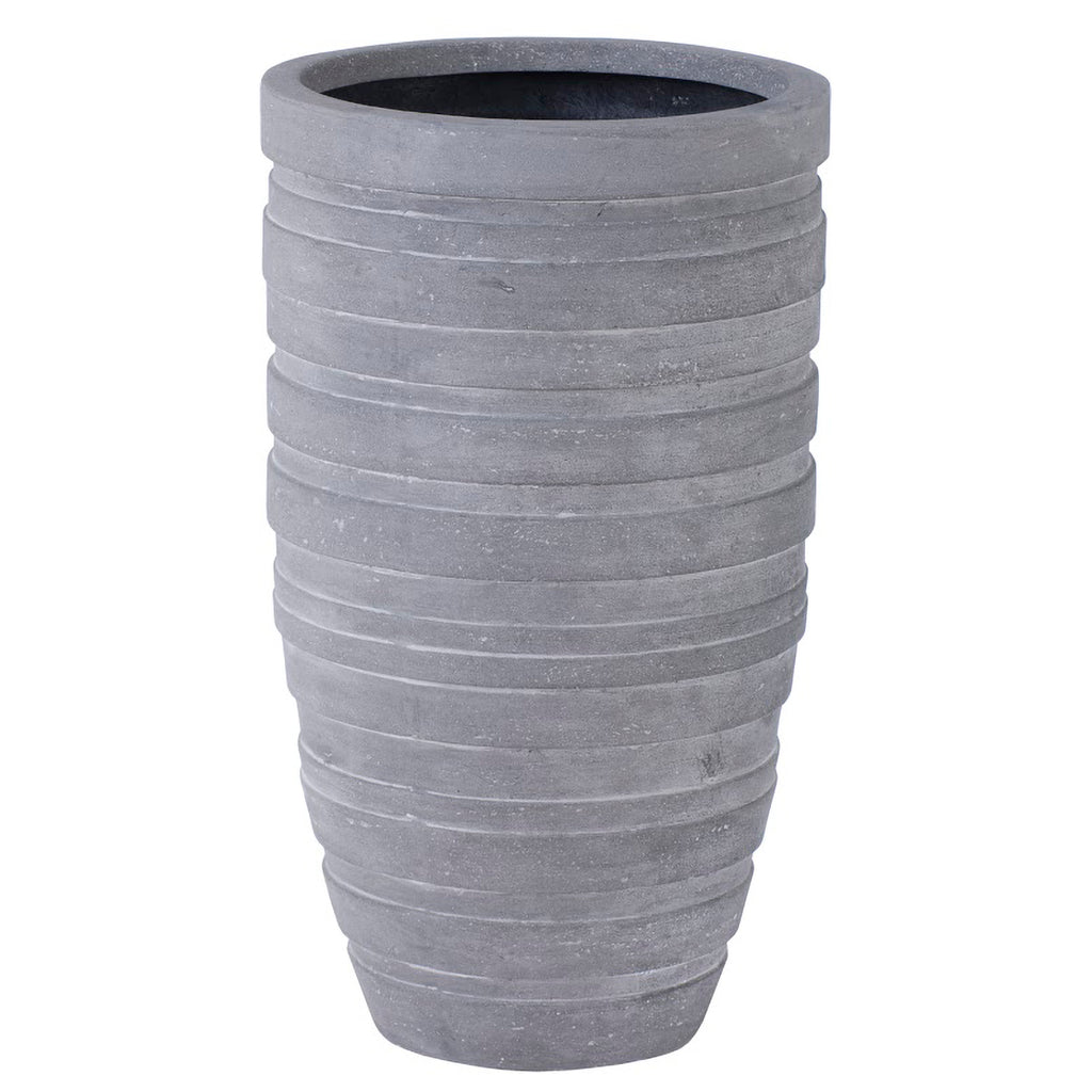 The June Slim Planter is good-looking in its handsome gray finish. Made of composite, its surface is striated to mimic fabric that has been wrapped around a vessel and slathered in a beautiful papier-mâché treatment. One of the loveliest aspects of this design is that it is strikingly contemporary for a garden planter thanks to its attractive gray finish and the top lip that rolls into its interior to leave the shape clean-lined.