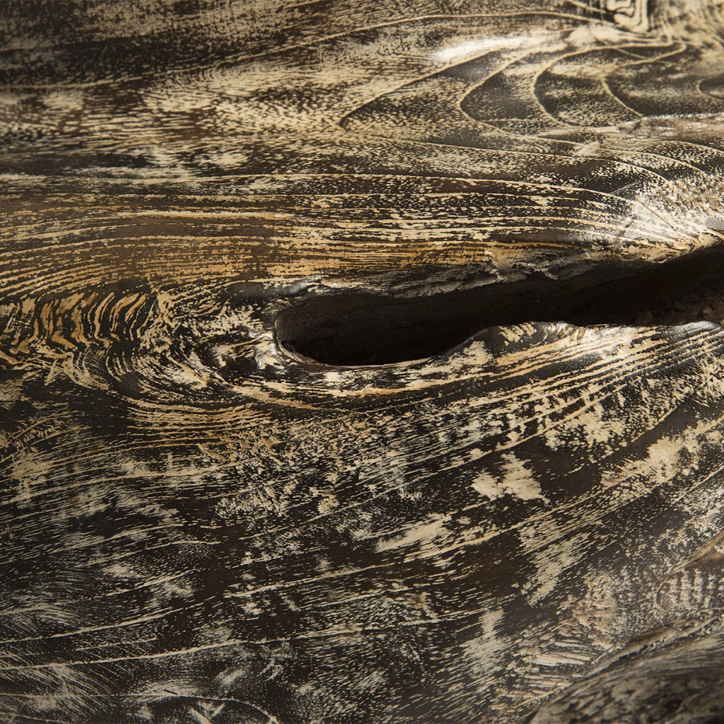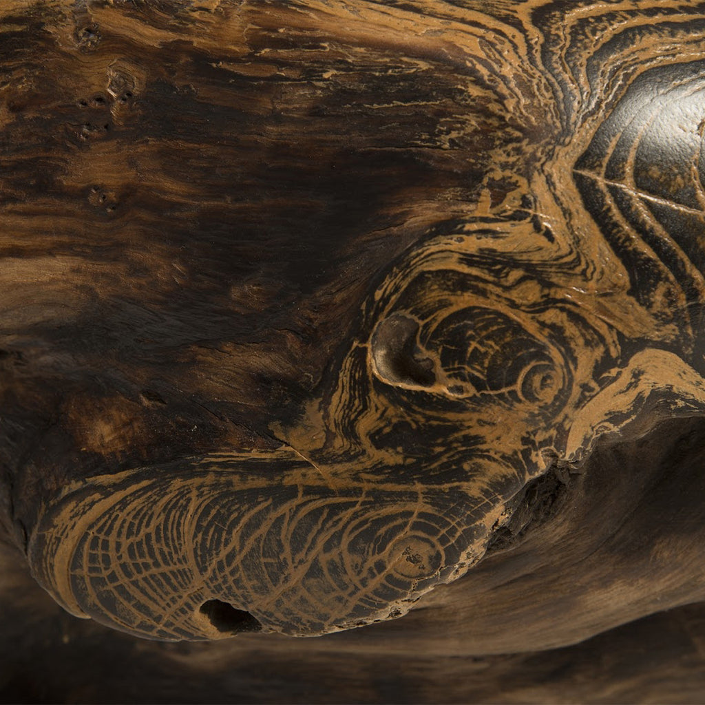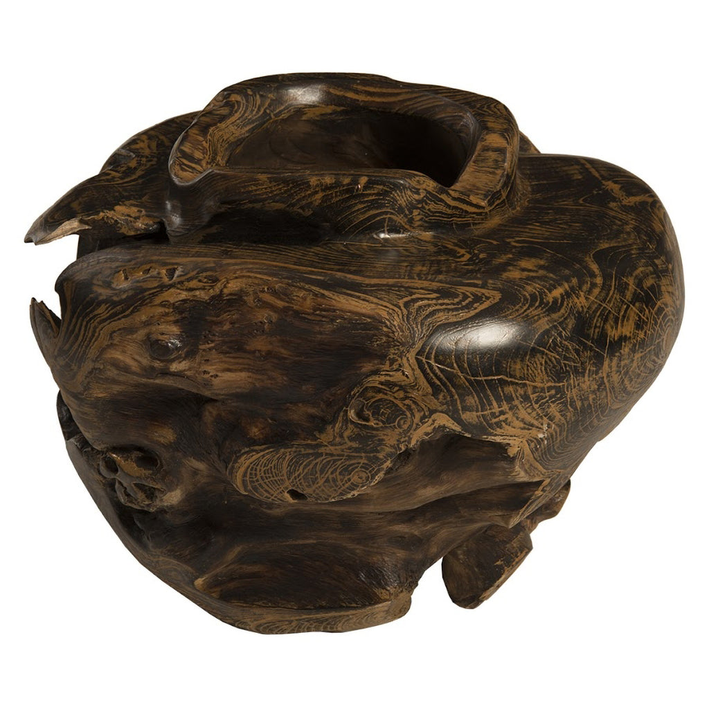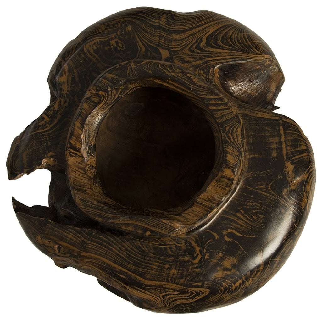 The Teak Planter is hand-crafted in Indonesia from unearthed teak roots that are lightly smoothed into these organic shapes. The dark brown or black planters are slathered with a finish to create an incredible textural surface when the woodgrain absorbs the treatment in differing degrees.