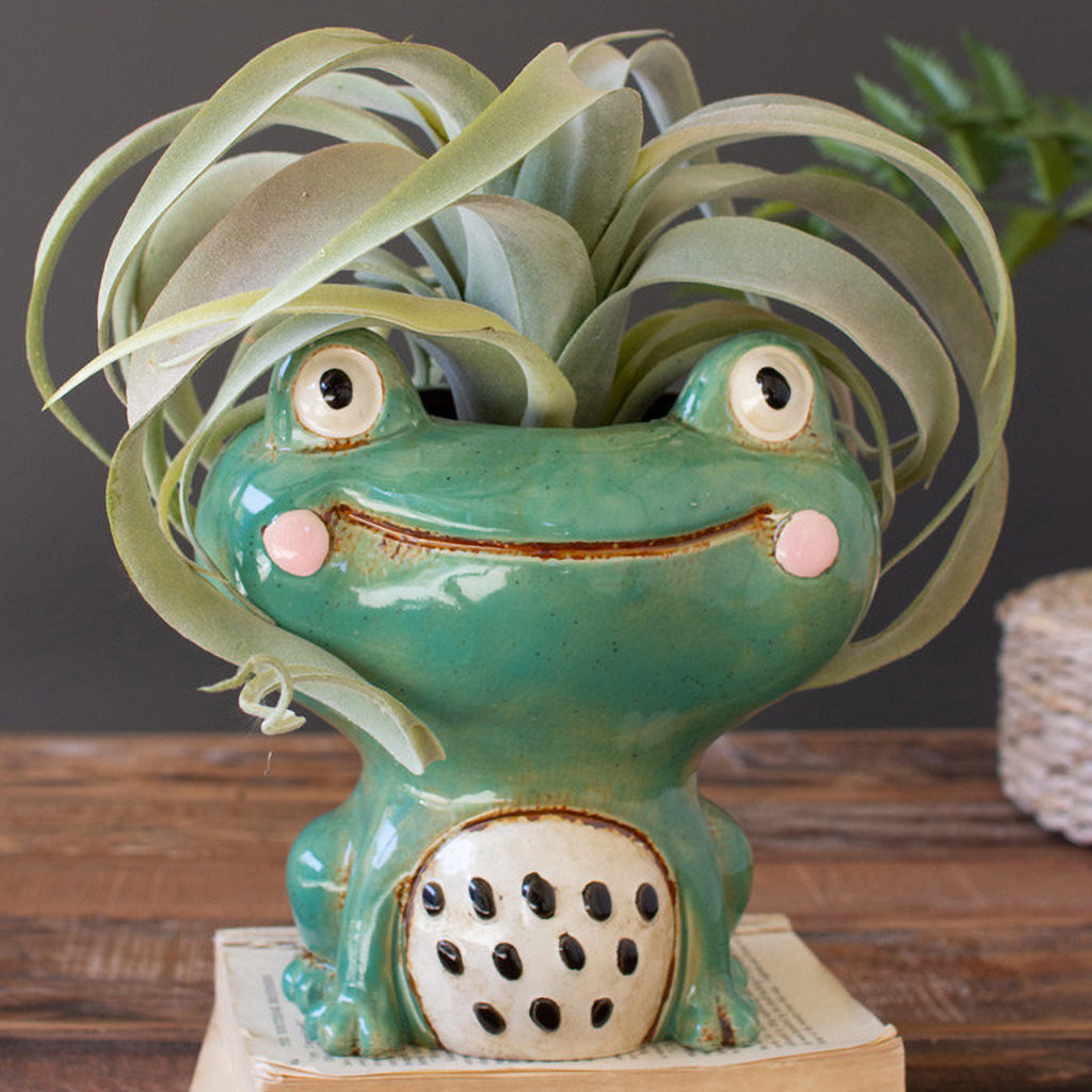 This friendly frog planter is made of ceramic and holds blooms botanicals or useful objects. The smiling frog face makes it suitable for children's areas and additions to fun planter collections. Store succulents or start a new grouping.