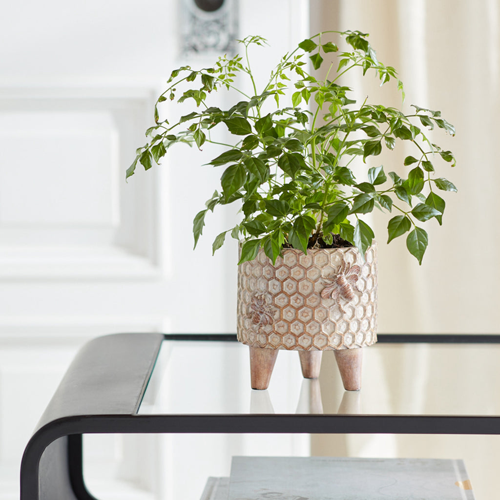 Display your plants in style with this stunning set of Decorative Pots with legs. Featuring two pieces, the faux wooden finish paired with the trendy honeycomb pattern and raised bee accent makes this set a great addition to your everyday home decor. The quality polyresin composition is sure to last for seasons to come. Complete the look by dropping a faux potted plant or floral arrangement in each pot.