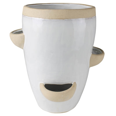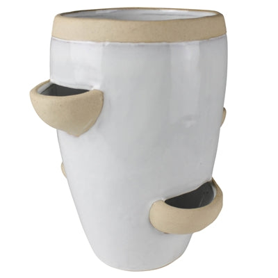 Multiple openings on this ceramic vessel is the opportunity to building unique planters. Traditionally used for dangling strawberry stems an updated take would be rambling vines or trailing succulents.