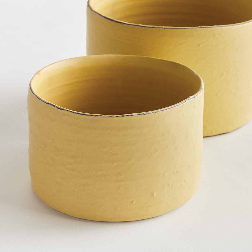 With a crackled glaze, uneven texture and basic form, this set of cachepots is simple and raw. In a refreshing buttercup yellow, like a freshly made ceramic piece direct from the hands of the artist.