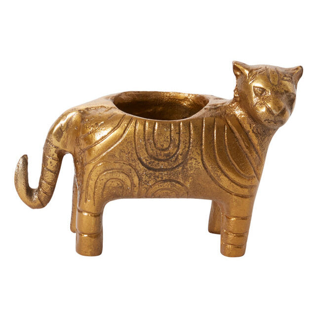 Behold the whimsical charm of the Tiger Pot, a recycled cast aluminum curiosity. This watertight piece is designed to fit a 2-inch drop-in pot, or it can be used as a decorative piece with an air plant or nothing at all on a desk or bookshelf. Crafted from a hand-carved mold, this sculptural vessel with its antique gold finish showcases handcrafted artistry & timeless beauty in every detail.