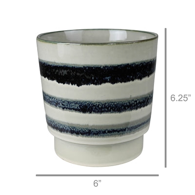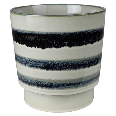 Undulating tones of indigo-inspired blue wrap in stripes around this unique footed ceramic cachepot. Due to the dynamic process of this glazing technique, the texture and density of the glaze on each piece will be unique.