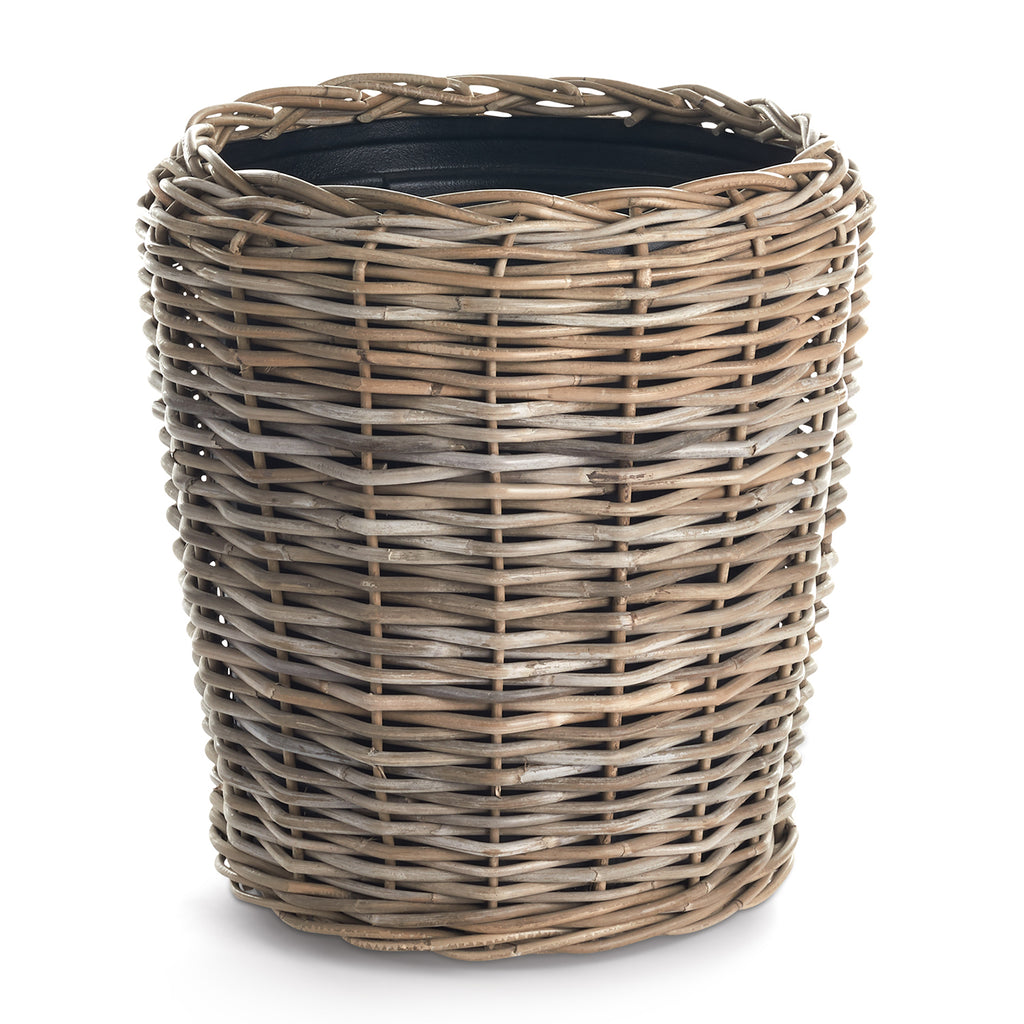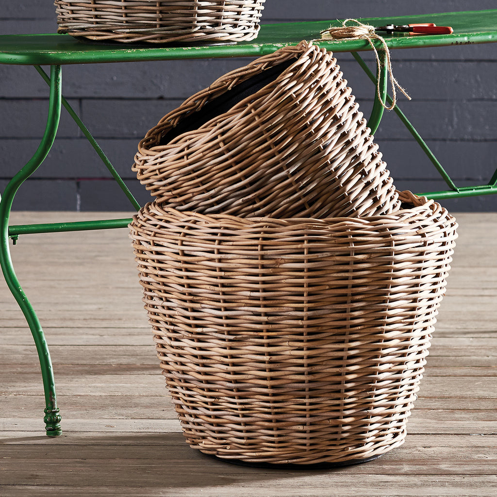 Here's a smart idea- a thick rattan planter tightly woven around grower's pots. The plastic pot helps the weave retain shape while elevating the rattan off the ground. Brilliant.
