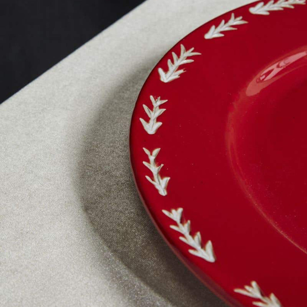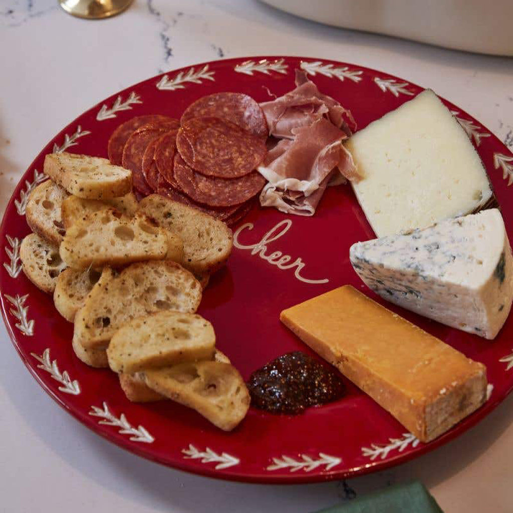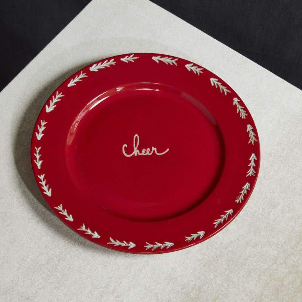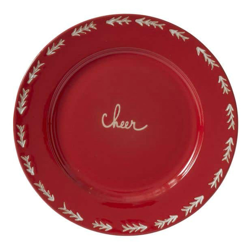 Spread holiday cheer with the very merry, cheery red ceramic Yuletide Charger. With white hand-painted details of etched evergreen sprigs & lettering, this lovely serving platter brings a handmade, understated elegance to the table.