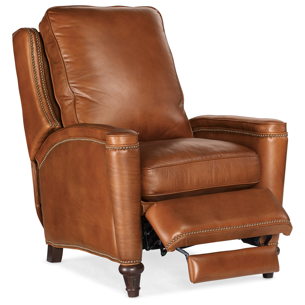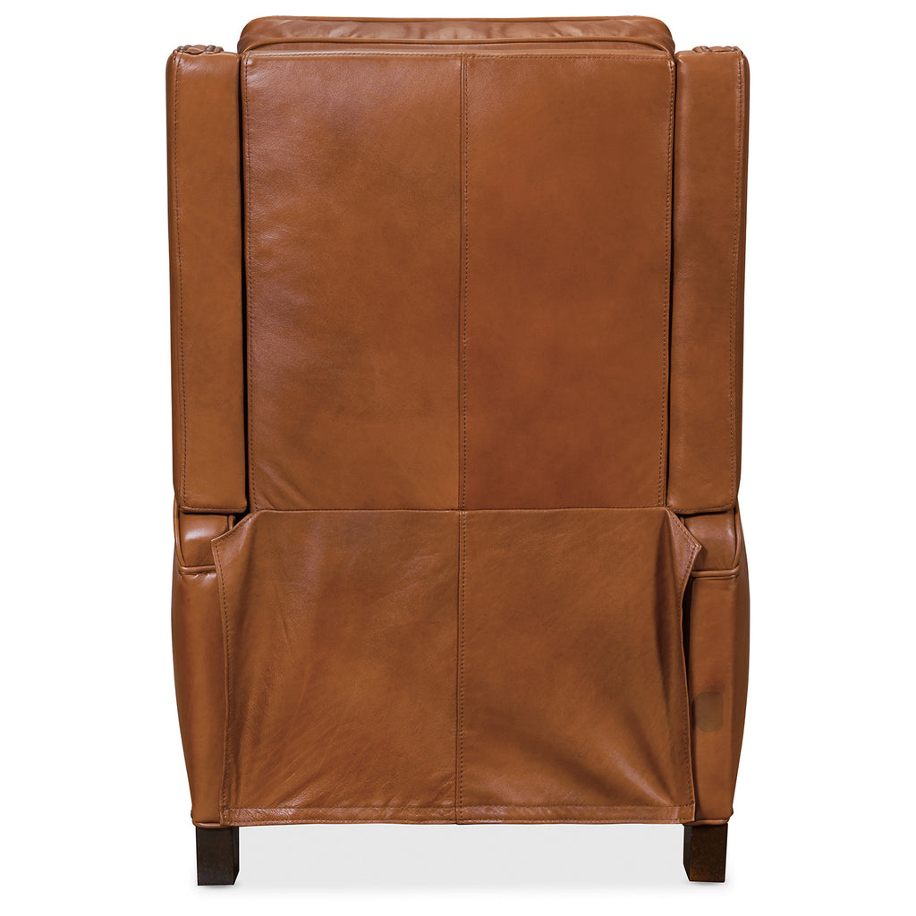 Curved arms, rounded posts and a shaped wing back trimmed in nailhead add distinction to the Rylea Manual Pushback Recliner Chair. The stylish manual recliner combines the Valencia aniline top grain leather in a soft bronze color with dark wood spool feet.
