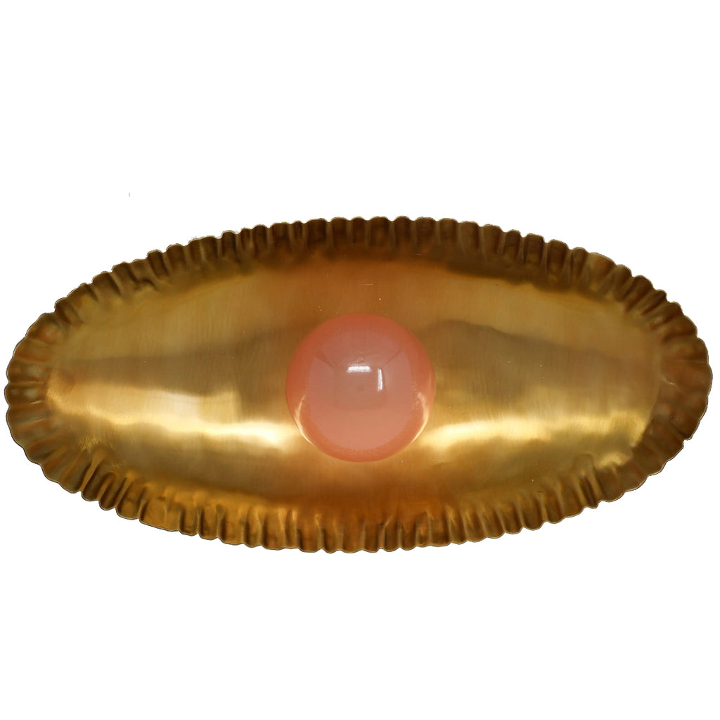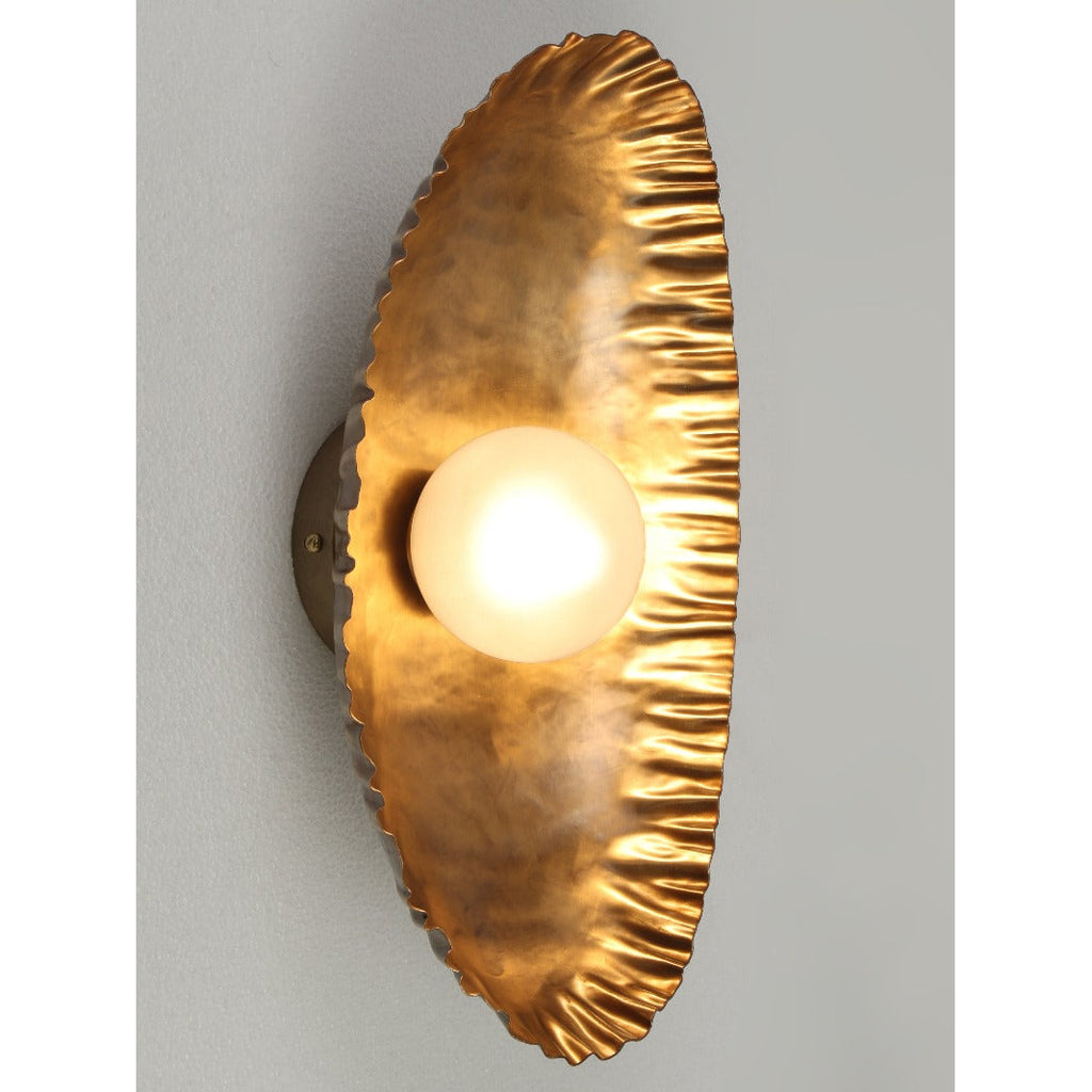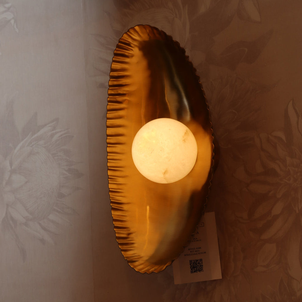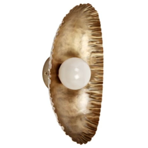 Our Camila Sconce base is luminously champagne with detailed edges complemented by a centered pearl-like bulb to project polished grace.