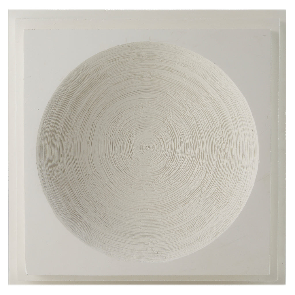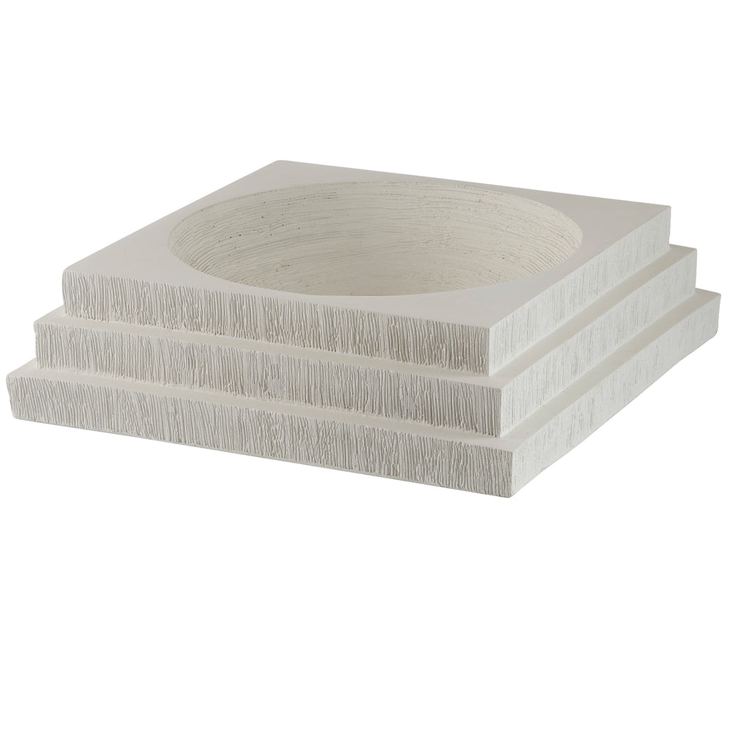 Our stepped centerpiece was designed with the same eye for classical forms as an ancient pyramid or architectural pedestal. This white resin form has a circular dip in the center, enhanced with contrasting matte texture line details. Finish will vary.