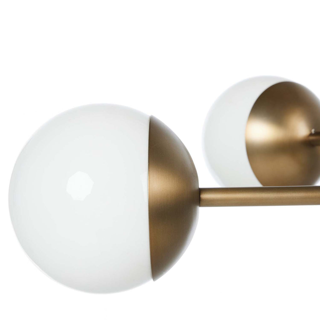 A cluster of milk glass bulbs extends from sculptural arms crafted from iron with an aged brass finish, creating a soft glow with and industrial edge.