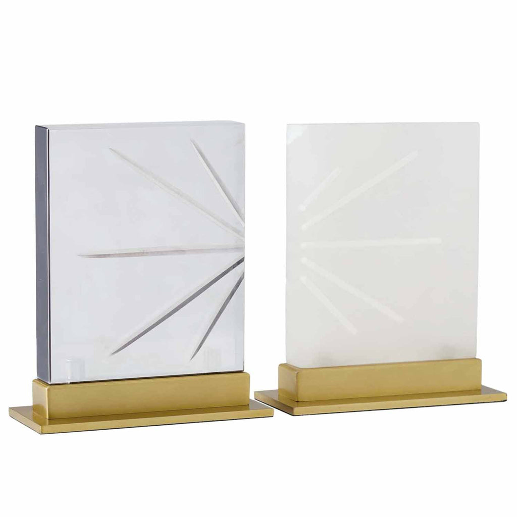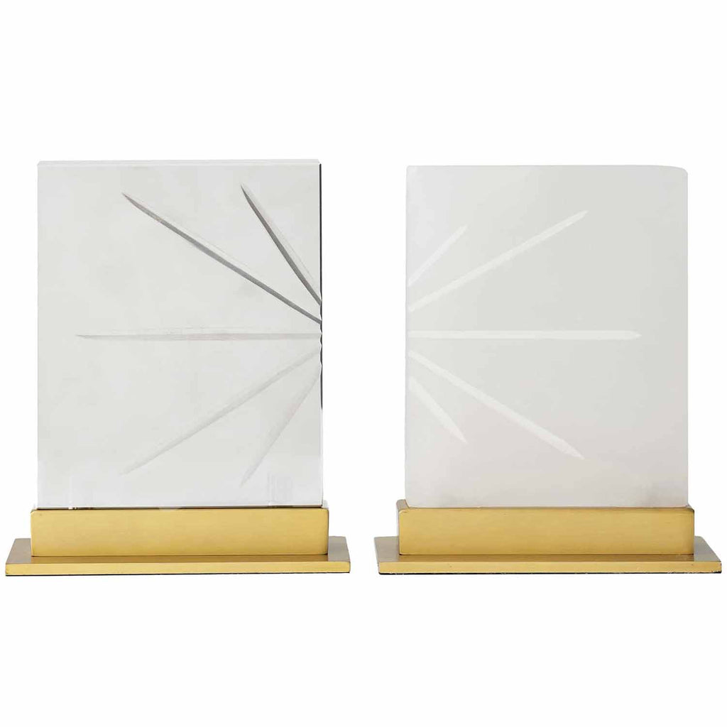 Our Arteriors Veridian sculptural objects are created as a slab of white alabaster and another in smoke crystal. Both pieces feature an etched radial design and rest on bases of antique brass steel. Use the pair as lavish bookends or place them together as sculptural objects. Finishes will vary.