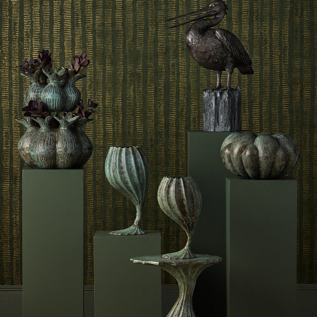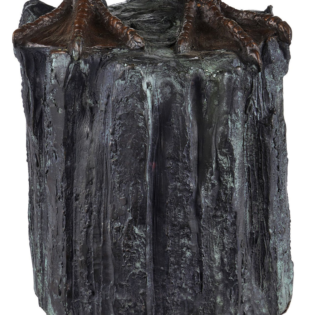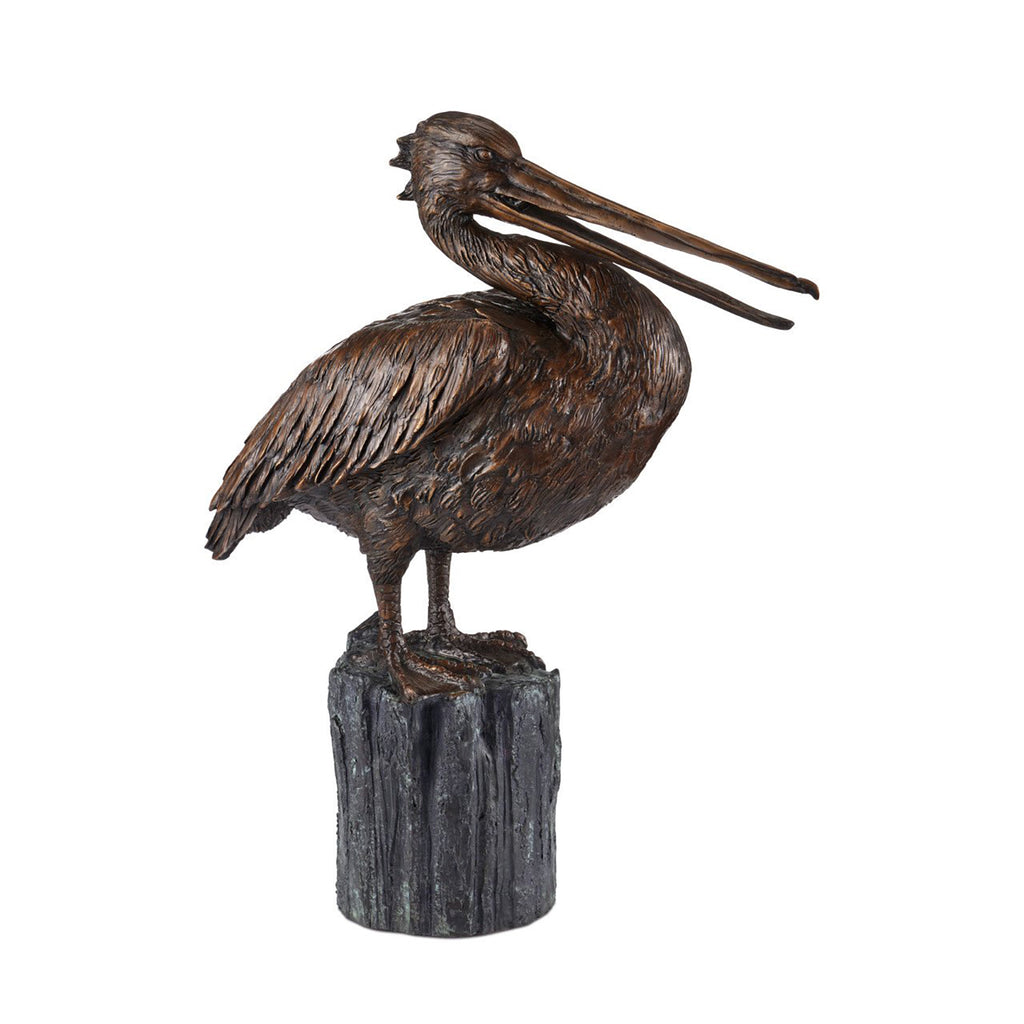 The Currey & Co Pelican Bronze sculpture is a remarkable piece of art. Finished in black bronze, this piece comes to life through a multi-step lost-wax casting process. After casting, the artist adds thoughtful touches like polishing or additional finishes to complete the look, illustrated here by the shine of the pelican itself juxtaposed against the matte finish of its perch.