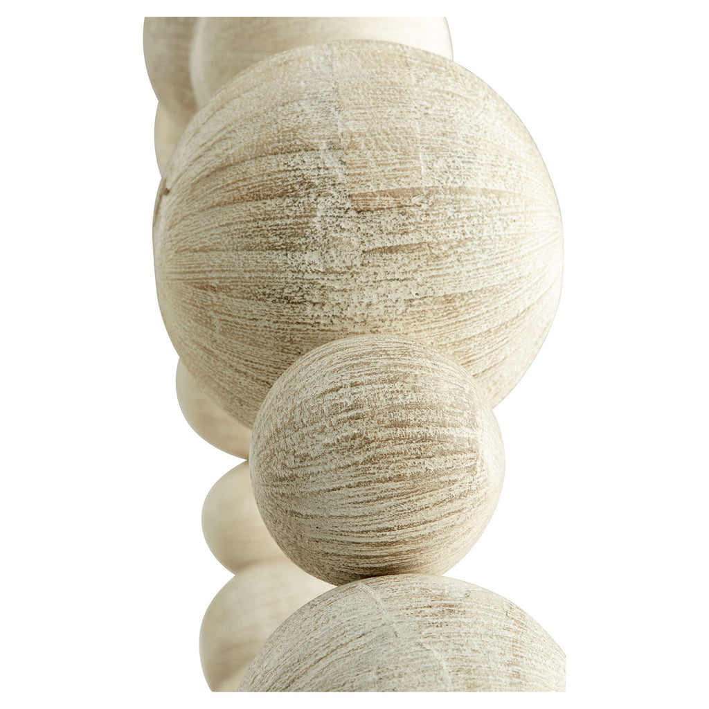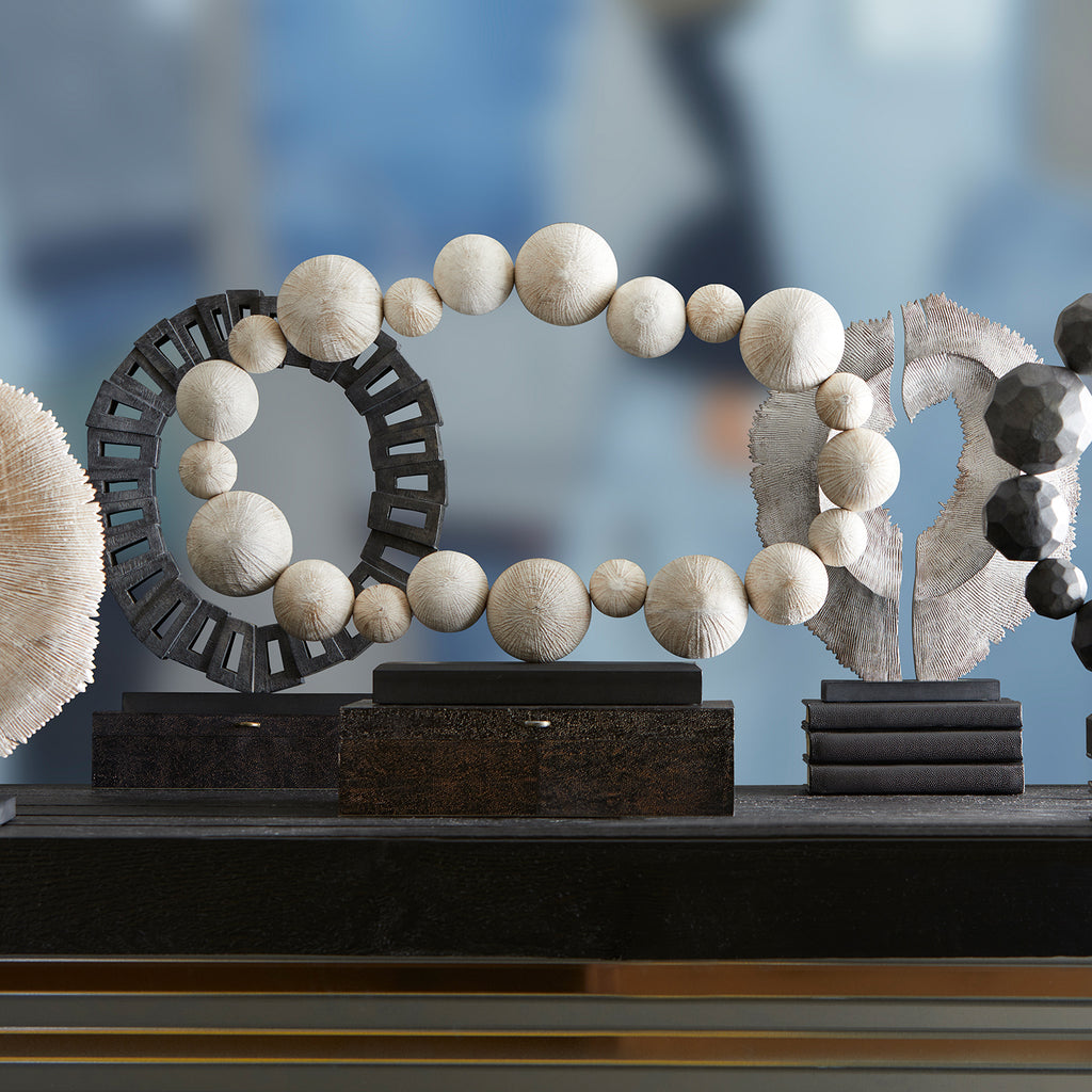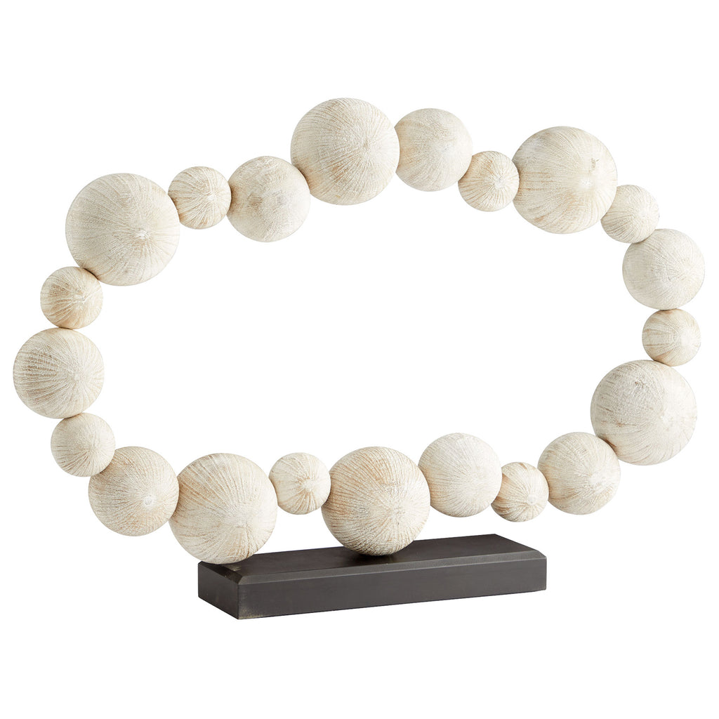 The chiseled spheres of the Garnet sculpture connect to form a circle perched atop a solid wood base. Made from Ardu wood and bearing a white washed finish, the sculpture serves as an enchanting addition to any setting. By displaying the Garnet sculpture, you are sure to fascinate your guests with its simplistic charm. Hand carved | Hand-applied Finish | Carved from Ardu Wood