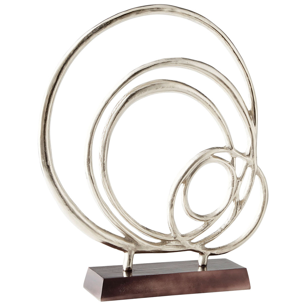 Organically shaped rings create an abstract presentation for this artful metal sculpture piece. Resting on a black finish base, the piece features a sleek nickel finish to complement transitional or contemporary interior design motifs in need of a little artistic pick-me-up.