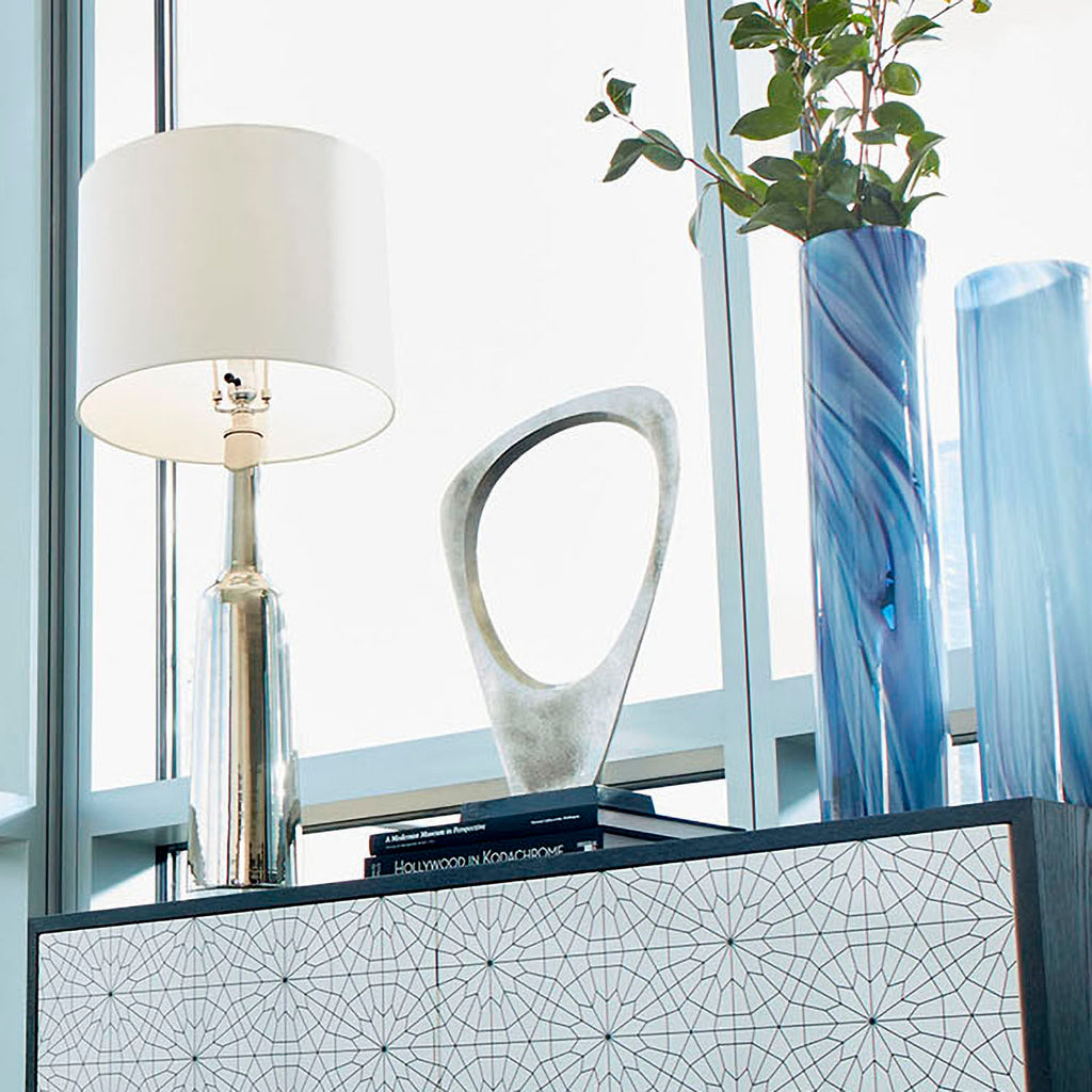 Leave meaning and significance up to the beholder with this engaging abstract contemporary sculpture. Crafted in aluminum with an open center, this large piece features a raw nickel finish with a bronze base finish for lovely contrast and dimensionality.