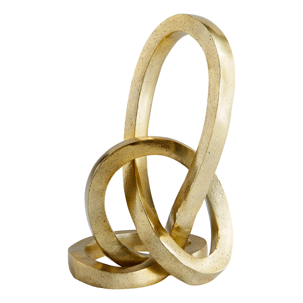 The Meridian sculpture is an abstract tabletop accent with a whimsical appeal. This stunning accessory marries the industrial styling of its metal composition with the gilded finish's luxury appeal. The continuous loop knots into a single entity with a perfectly balanced surface base. This accent is a great addition for enhancing the ambiance while simultaneously maintaining a harmonious vibe in any commercial or residential space. Designed for Cyan Design by J. Kent Martin.