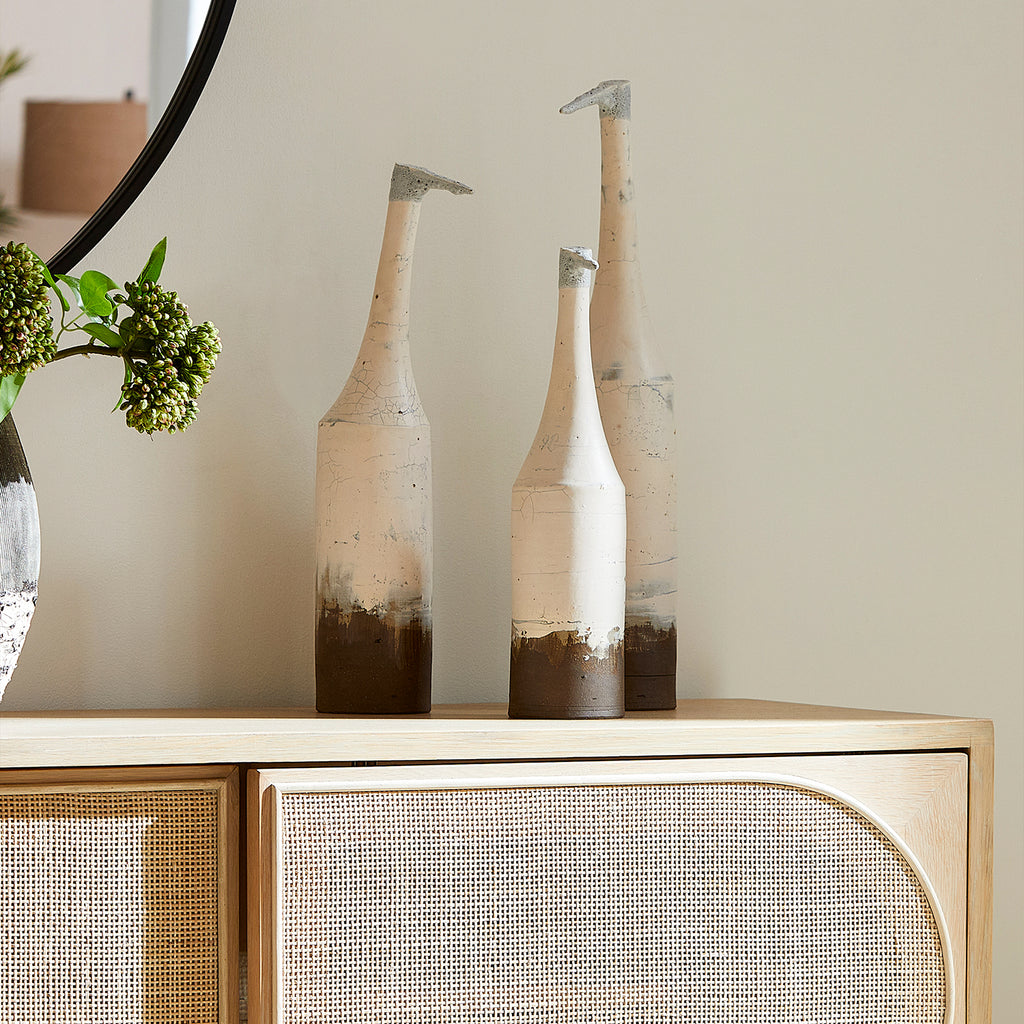 Taken from hand-thrown originals created by internationally recognized ceramicist Ani Kasten, the Egret vases’ trademark quality is the material used in production. Aligning with Ani’s practice of sustainably sourcing her materials around her home in Shafer, Minnesota, a proprietary blend of natural and recycled components is bound together to create a strong alternative that is biodegradable and eco-friendly. Casting is done by skilled artisans using timeless craft traditions of the desert. The Egret collection of off-white and brown ombre bird-like bottle sculpture captures the essence of nature while remaining grounded in luxury design.