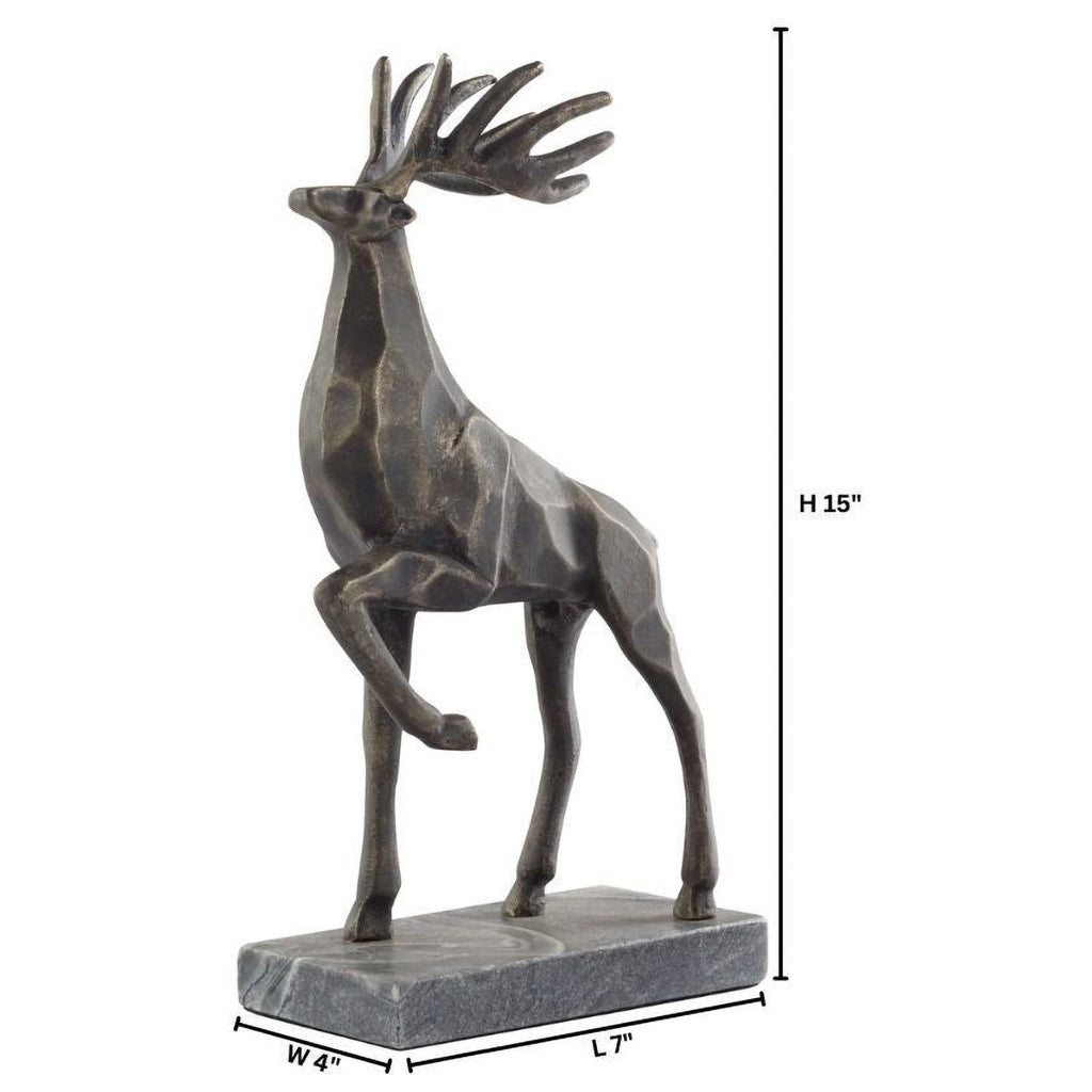 The Hirco sculpture features a stunning stag with a faceted surface, meticulously cast in metal and finished with an antique pewter coating. The facets reflect light in a way that enhances the sculpture’s grandeur, while elevating the piece’s embodiment of nature’s regal splendor. Resting on a Bhainslana marble base, the Hirco Sculpture strikes a harmonious balance between the grace and grandeur of the natural world.