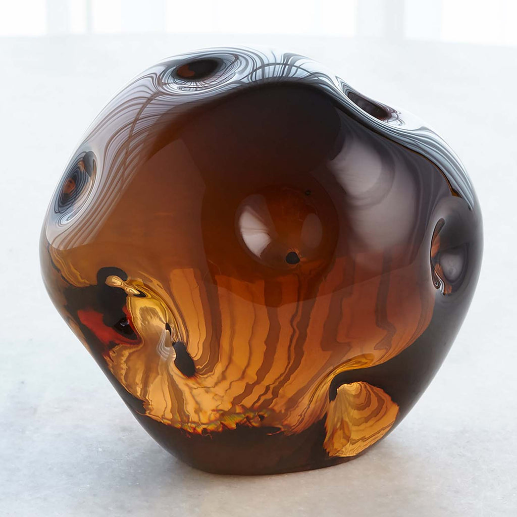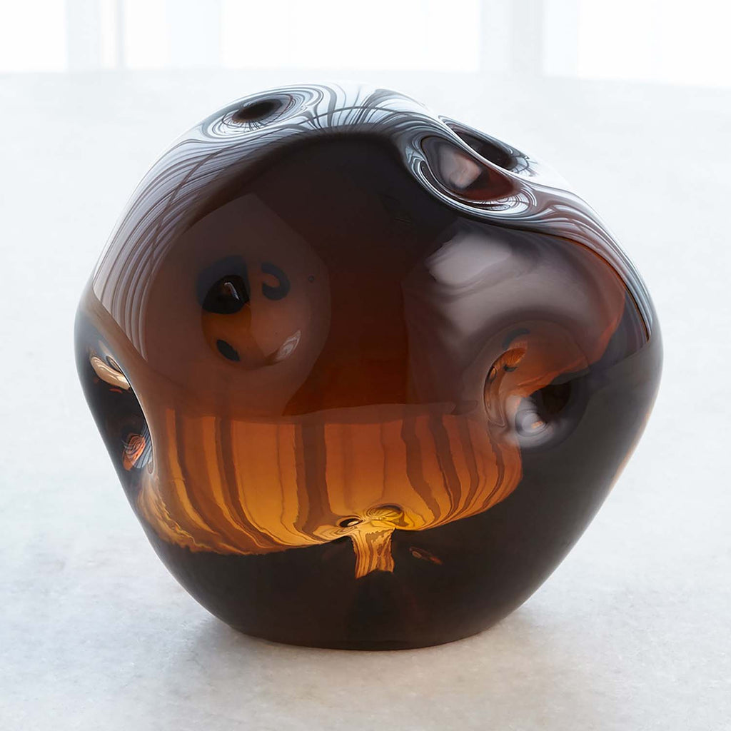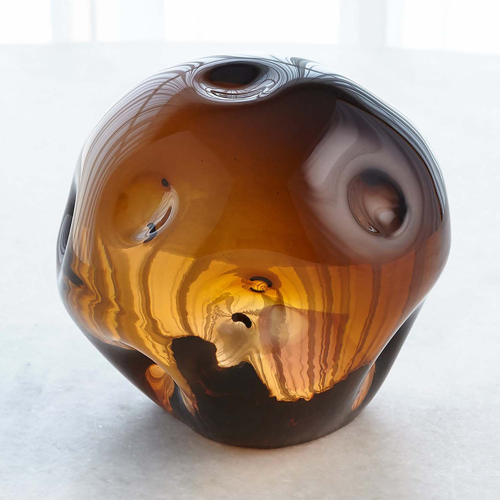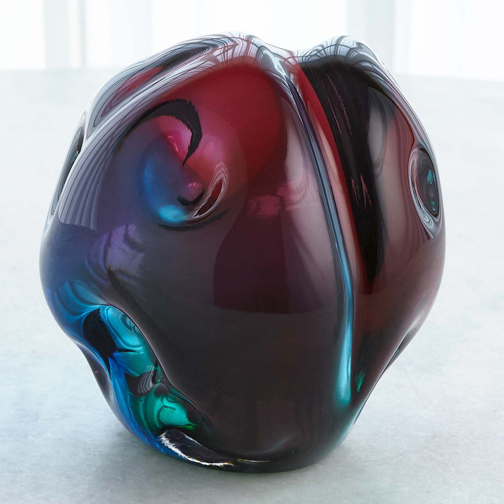 The Global Views Dimpled Spheres are created in a small art glass factory located in the south-eastern point of Poland. Each sphere is formed out of molten glass and then perforated with a tool to create the dimpling effect. Each piece is unique, so shape and color may vary.