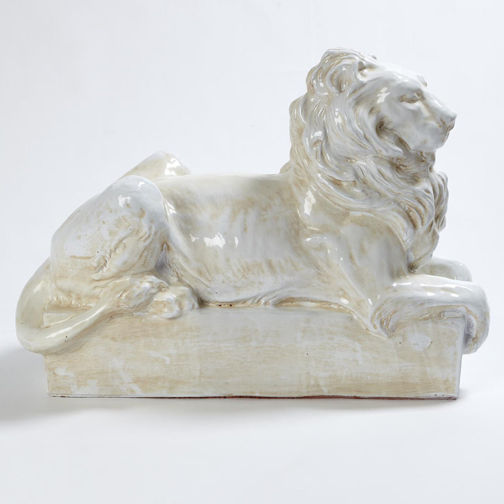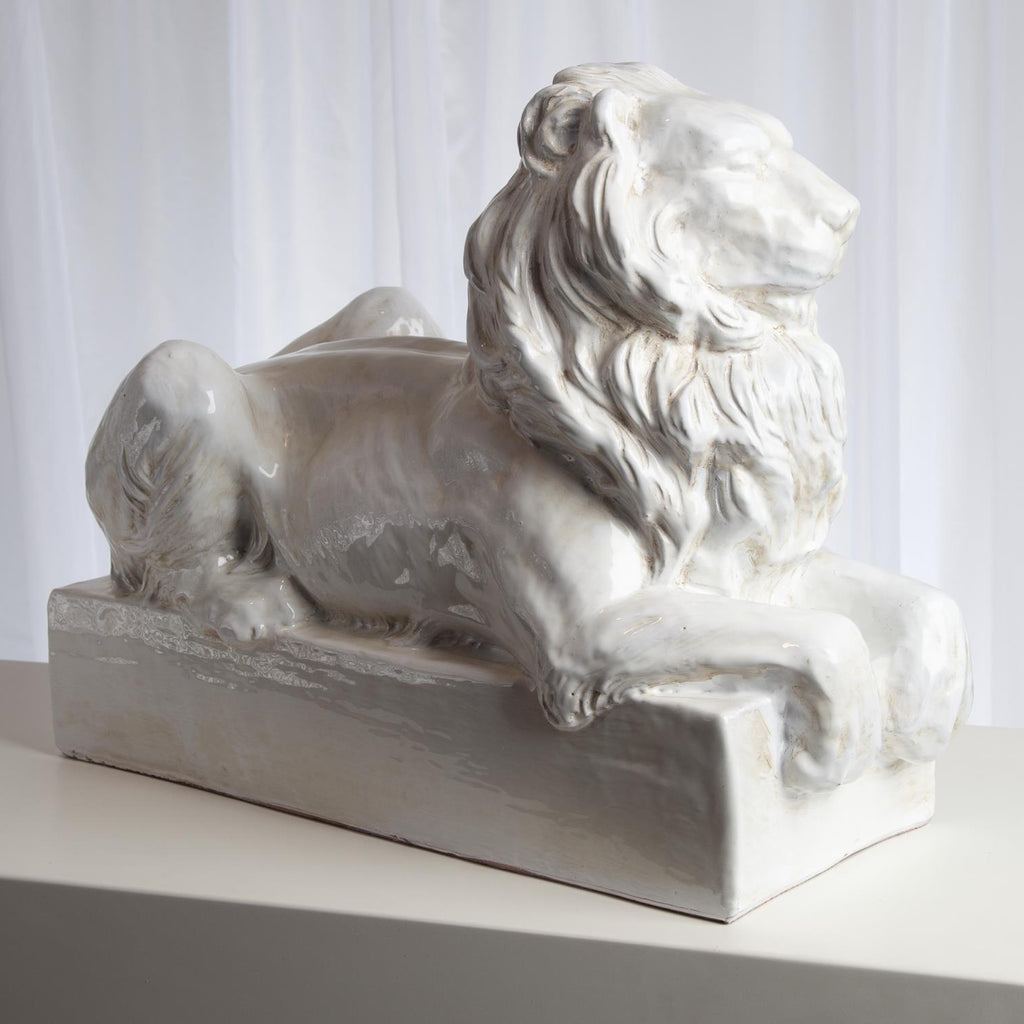 From the mind and imagination of George Sellers, our in-house sculpture and design director and a mound of clay comes a carved original model of this reclining lion. The original was then cast in plaster and sent to a factory in Italy to be produced in a terracotta based ceramic material in the technique Italians call "calco", whereby terracotta ceramic is packed when wet into a detailed mold. Drying over time, the terracotta ceramic pulls away from the wall of the mold and removed to be fired in a 950 degree kiln, then fired a 2nd time after being glazed in our signature antique white glaze. A design trend and direction we believe in as a company is a return to classicism as inspiration for the future of home decor.