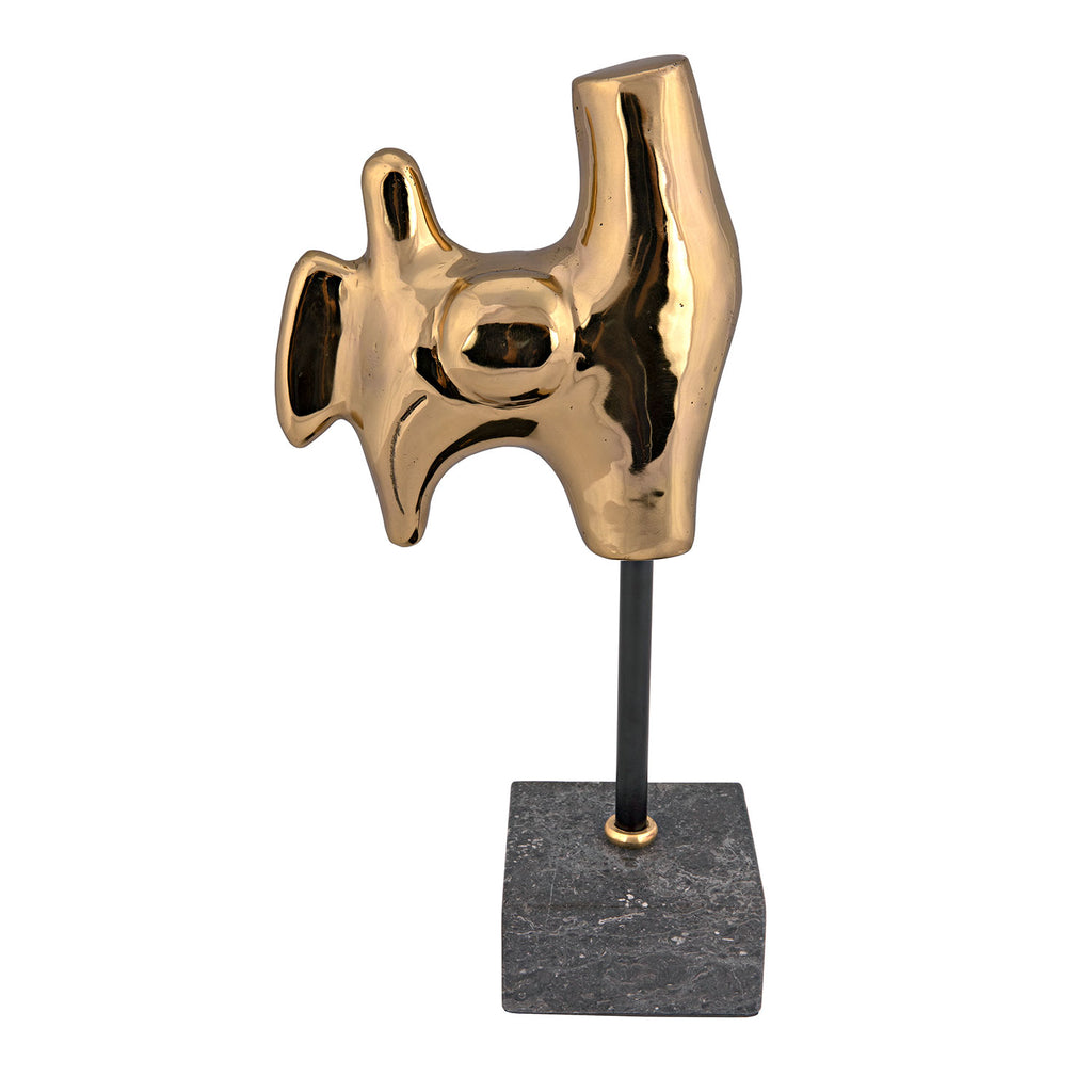 Take your everyday decor to the next level with the glamorous Noir Goker sculpture. Offering subtle nods to minimalist style, this effortlessly chic accent captivates atop a mantle. Inspired by mid-century abstract forms, this mesmerizing sculpture’s abstract shape references both anatomy and surrealism. Expertly handcrafted of metal with a burnished and antiqued brass finish, it is elevated by a museum quality black marble base.