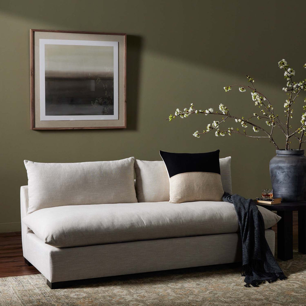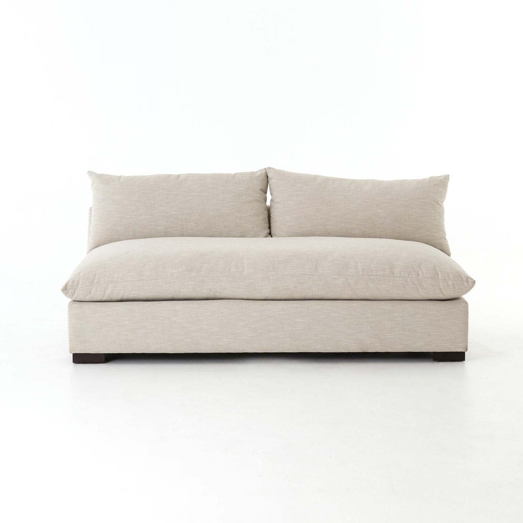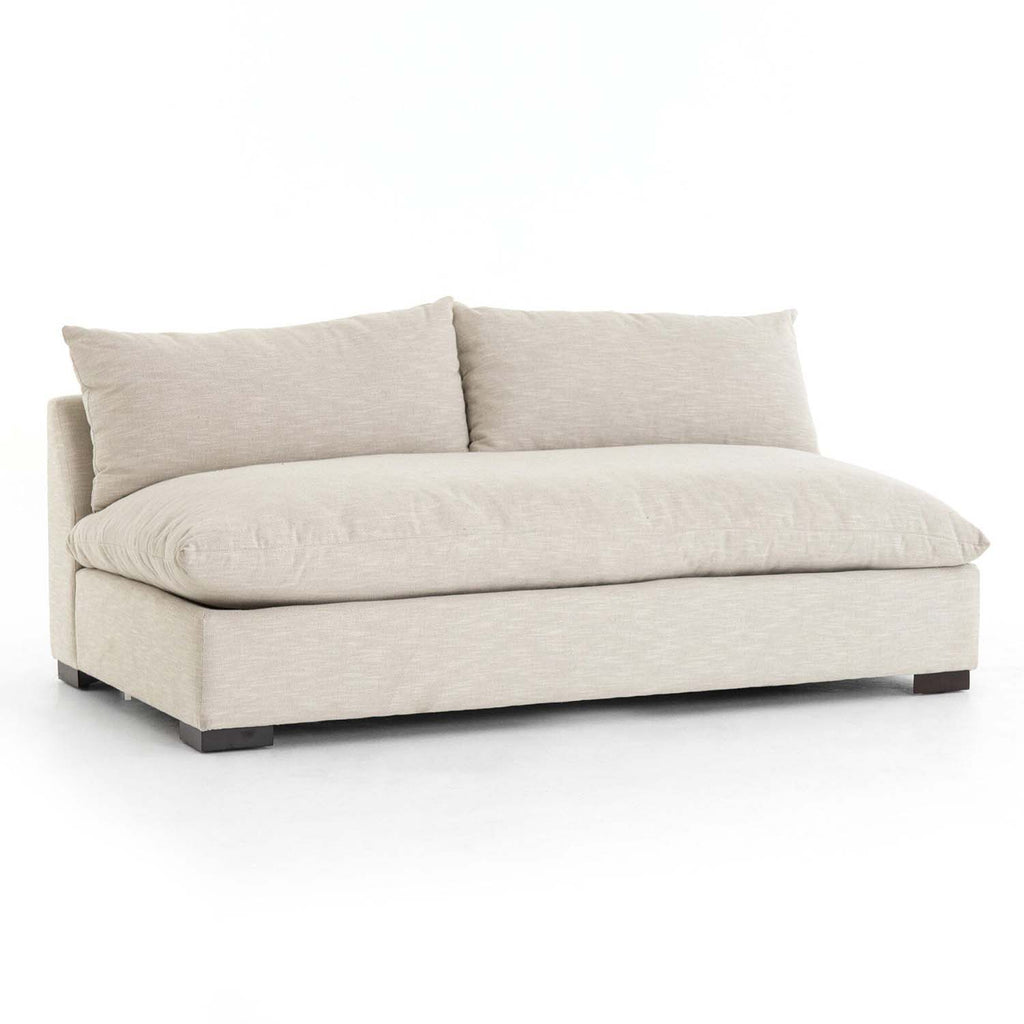 Welcome to the modern lounging essential. An armless three-seater sofa is upholstered in high-performance fabric. Armless sofa to matching sectional. Performance fabrics are specially created to withstand spills, stains, high traffic and wear, ensuring long-term comfort and unmatched durability.